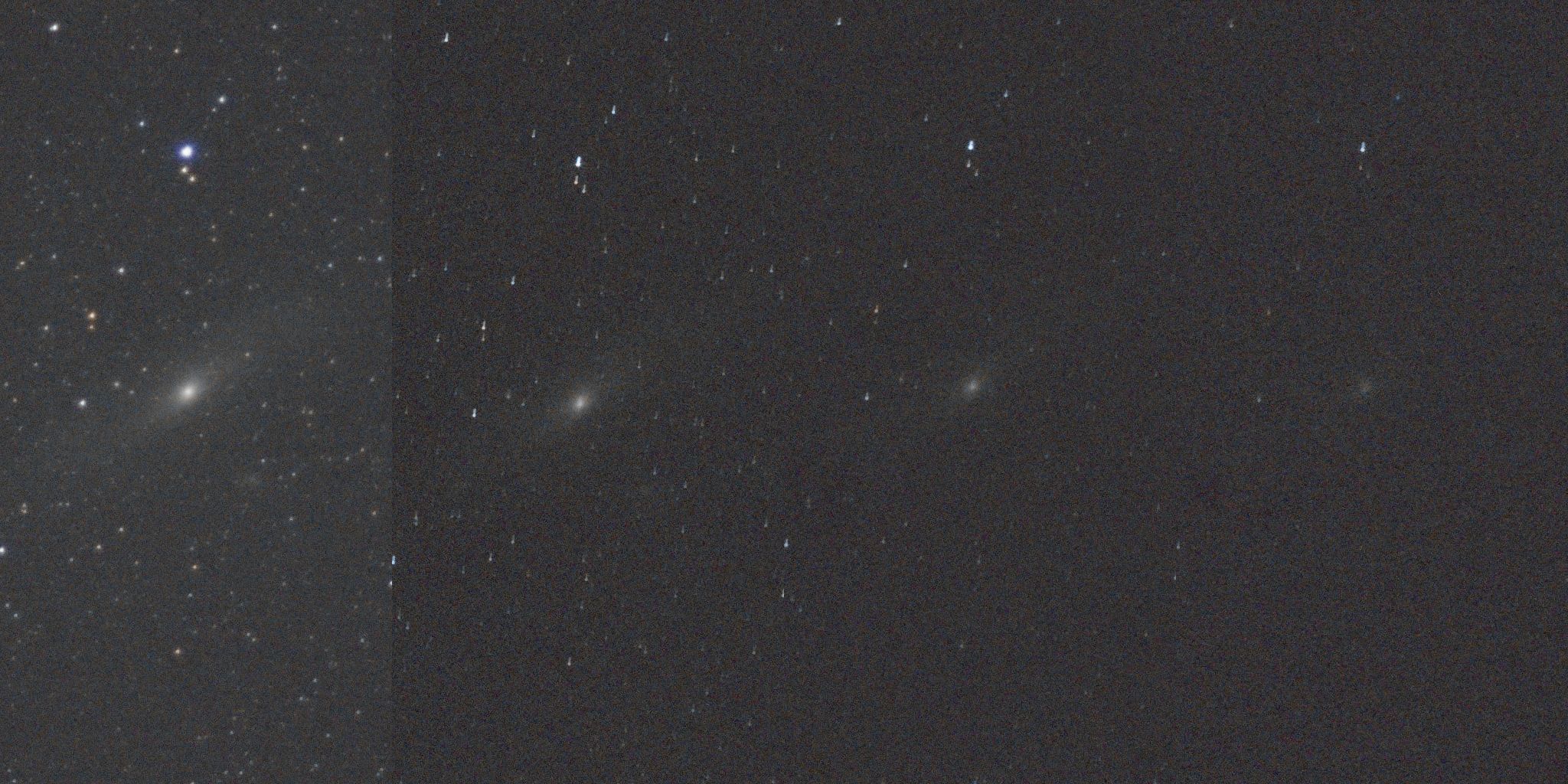 Here is the Andromeda Galaxy with a 32-second exposure at ISO 640. The stops increase left to right from f/2, f/4, and f/8 to f/22.