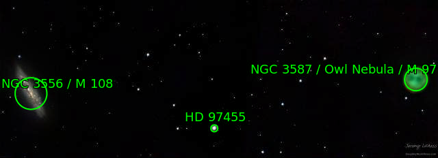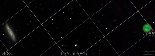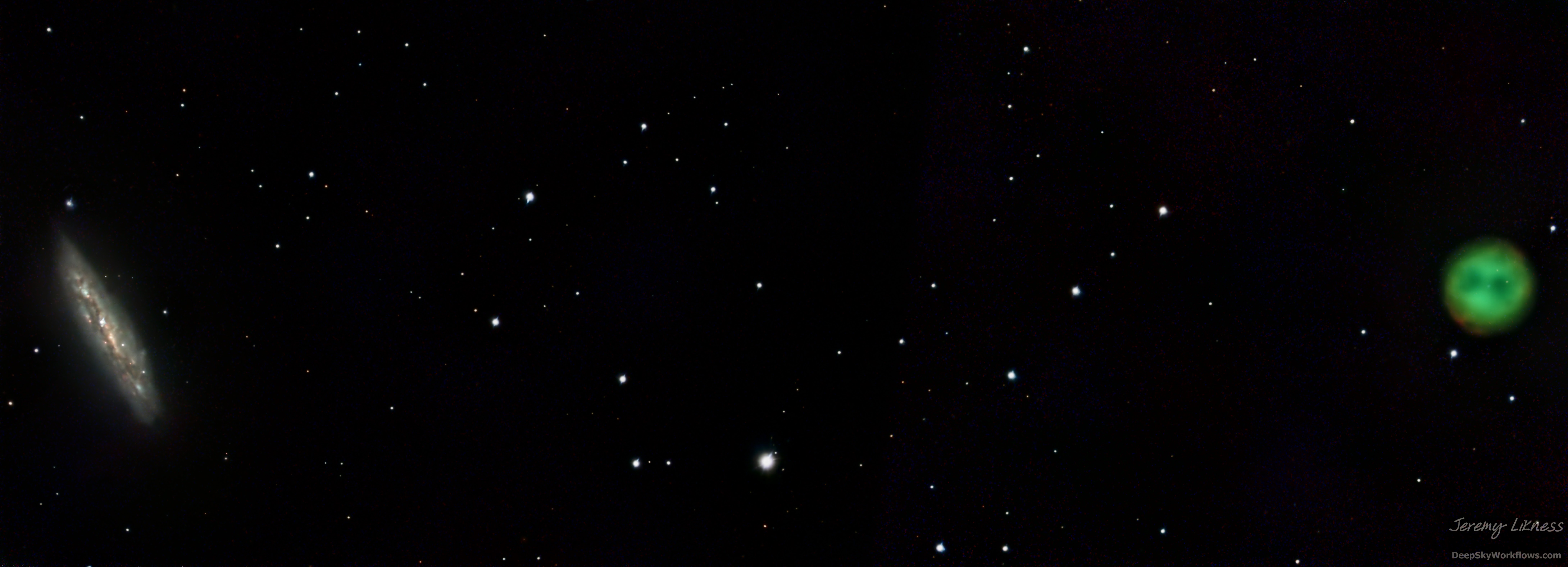 In the left corner, coming from the constellation Ursa Major, weighing in at 125 billion times the mass of the sun, designation M108 the Surfboard Galaxy! To the right, lightweight division M97, weighing in at 1/10th the mass of our sun, still blasting interstellar winds at the age of 8,000, the Owl Nebula! Together, I call them... Arkanoid.