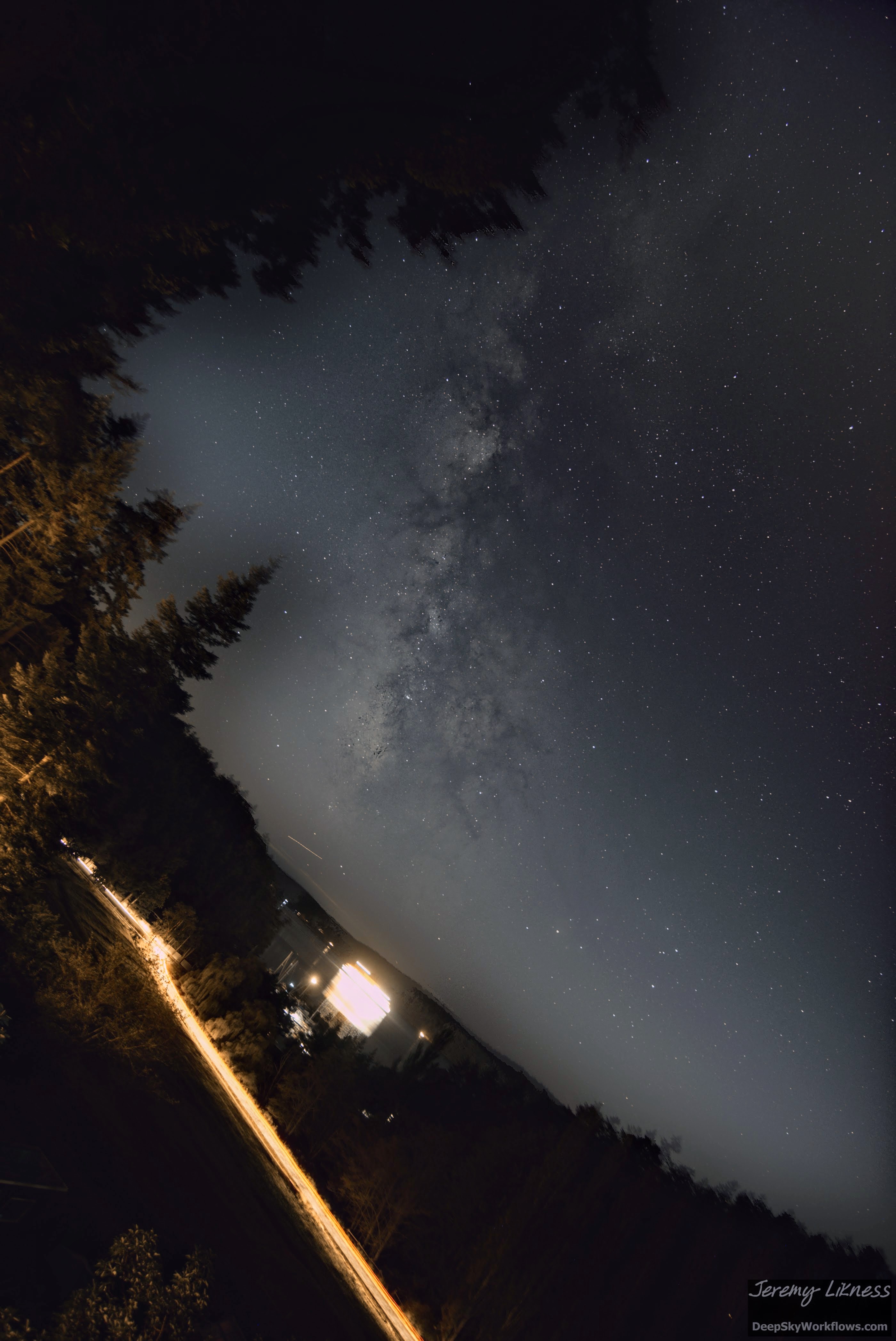 I visited friends with a deck overlooking the bay where the ferries shuttle people between islands and the mainland. Using my Sony Alpha camera on a tripod, I took several 20-second exposures to combine for the Milky Way. The ferry happened to cross around the same time and left a dazzling bar of light.