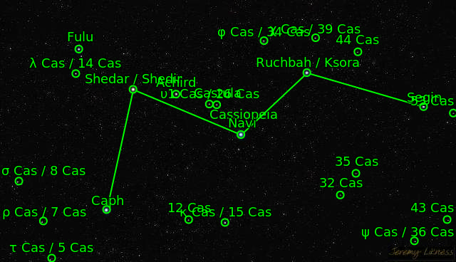 The star ζCas The star Schedar (αCas) The star ηCas The constellation Cassiopeia (Cas) The star Caph (βCas) The star Ruchbah (δCas) NGC281 The star κCas NGC7789 The star υ2Cas The star ρCas The star Navi (γCas) The star εCas