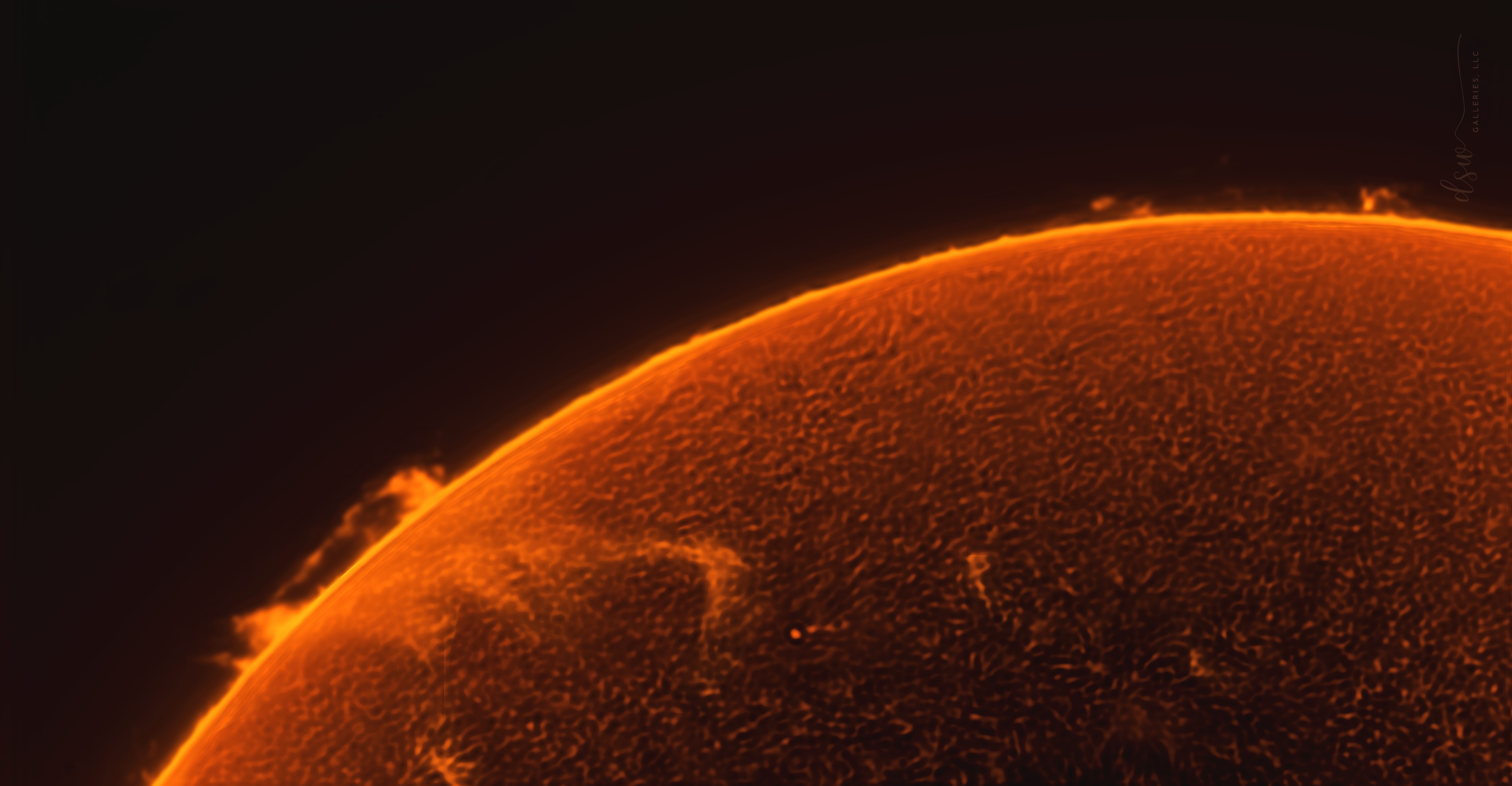 Hydrogen alpha filters admit only an extremely small amount of light, measured in angstroms (10 angstroms is 1 nanometer). The contrast gives us a view into the chromosphere, a layer of plasma and gas that exists above the sun's photosphere, or 'surface' as we know it. We can see variations in temperature on the solar surface. Large, round structures are sunspots - still thousands of degrees Fahrenheit but cooler than their surroundings due to the effect of magnetic fields. These same fields can suspend columns of superheated gas above the surface. At the edge, prominences snake out looking deceptively small but spanning spaces larger than the earth. Seen head on, they appear as elongated filaments. Here is our closest star from early afternoon on Tuesday, March 26th.