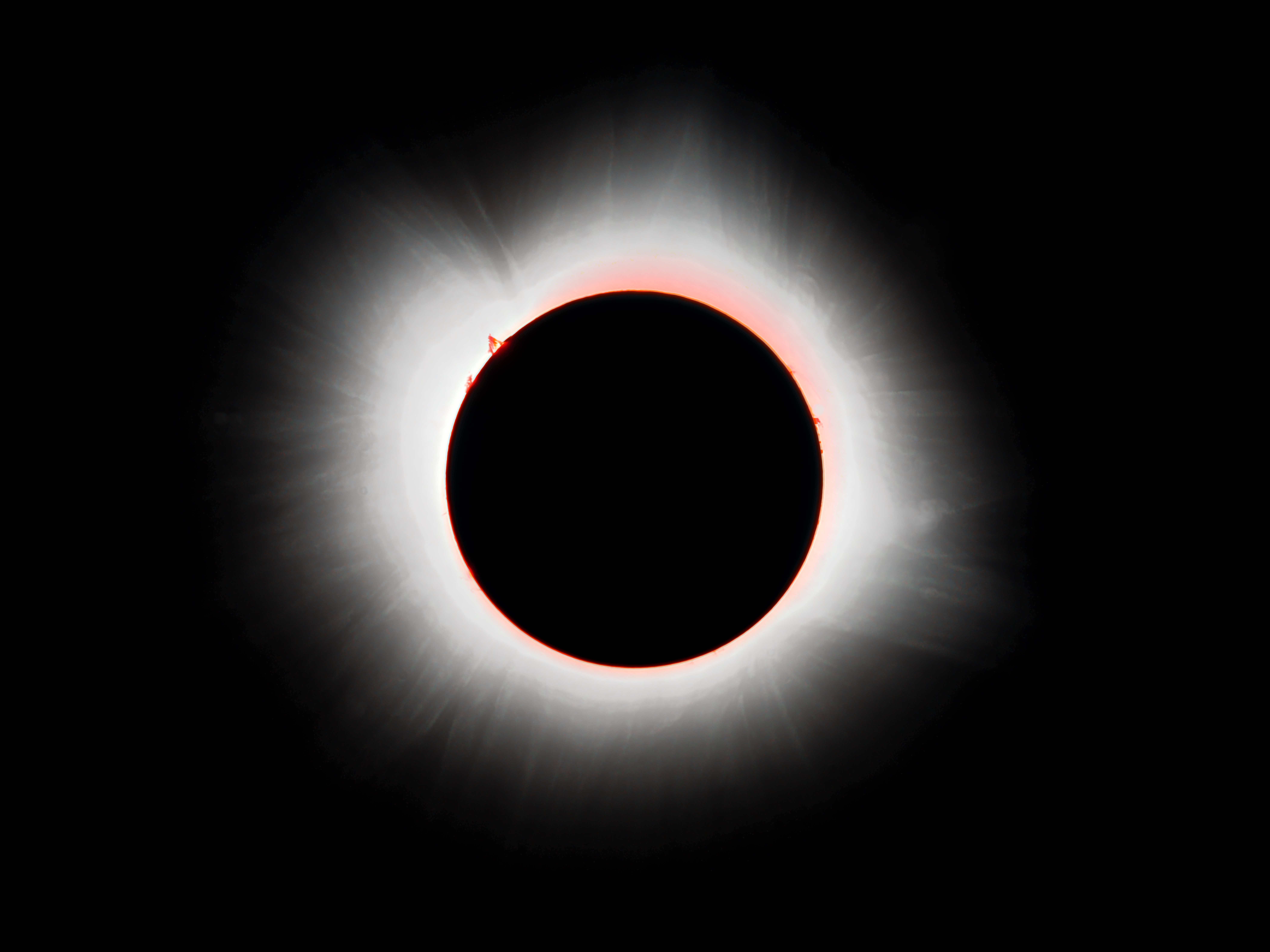 This is my most detailed shot I was able to take of the corona and eclipse during totality. It clearly shows the prominences that were visible at the time of the eclipse, as well as the long radiating tendrils of corona that became visible thanks to the moon covering all of the white light from the sun's disc.