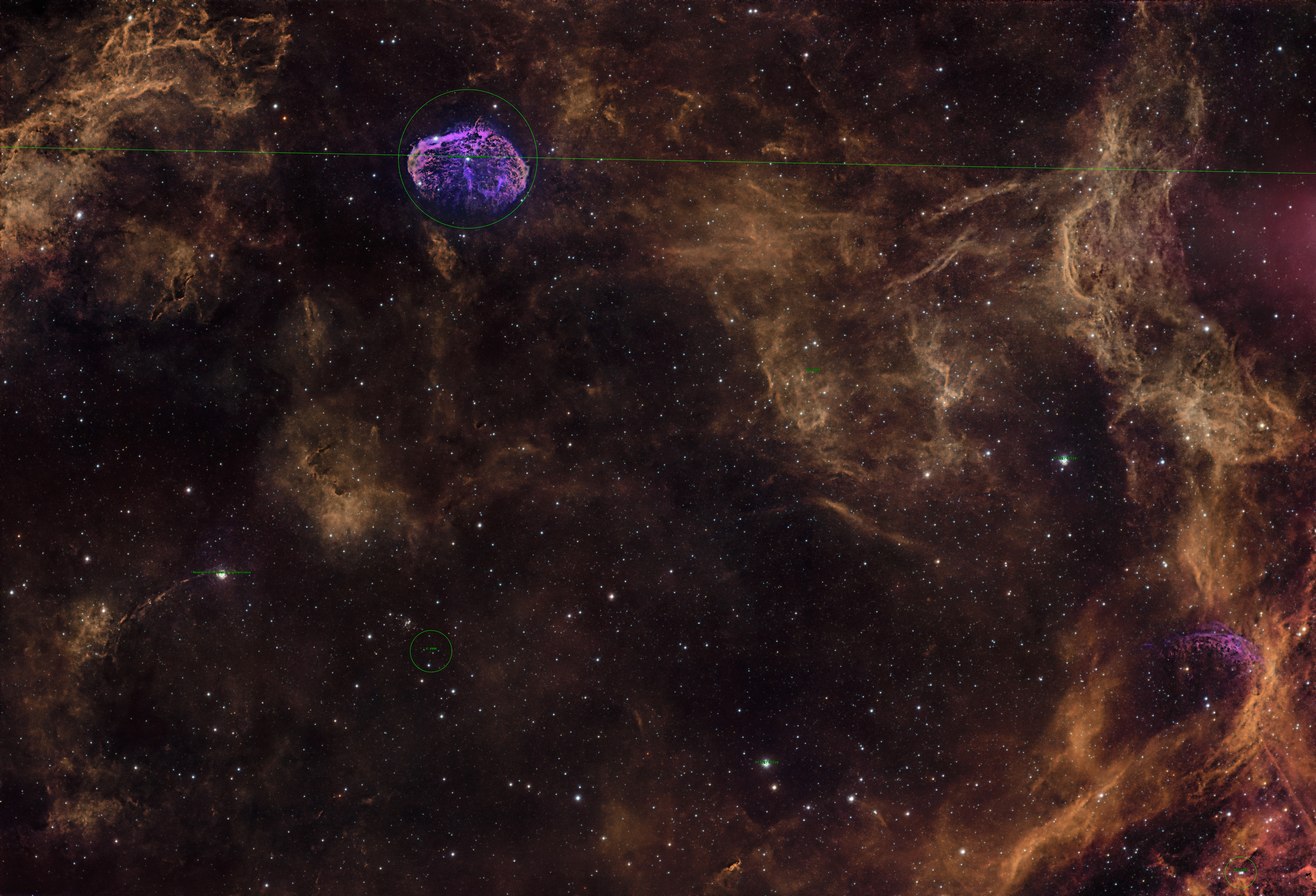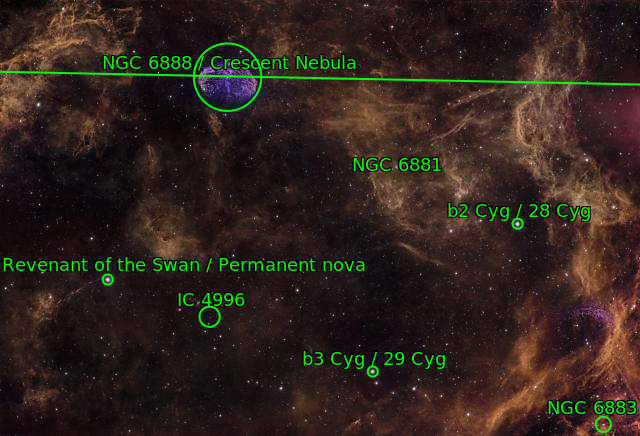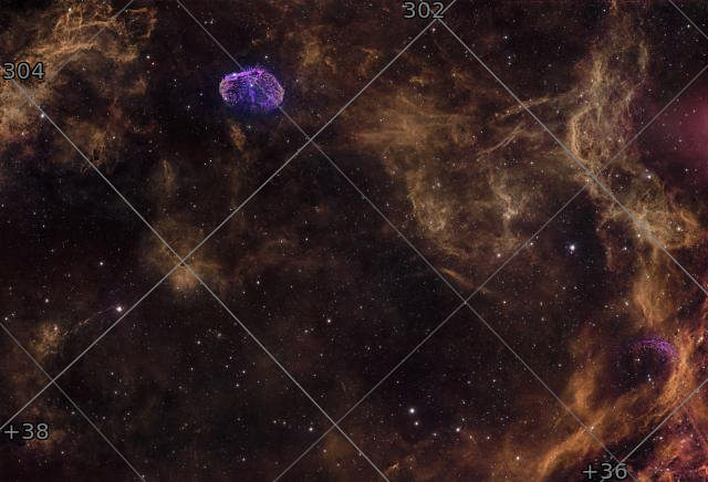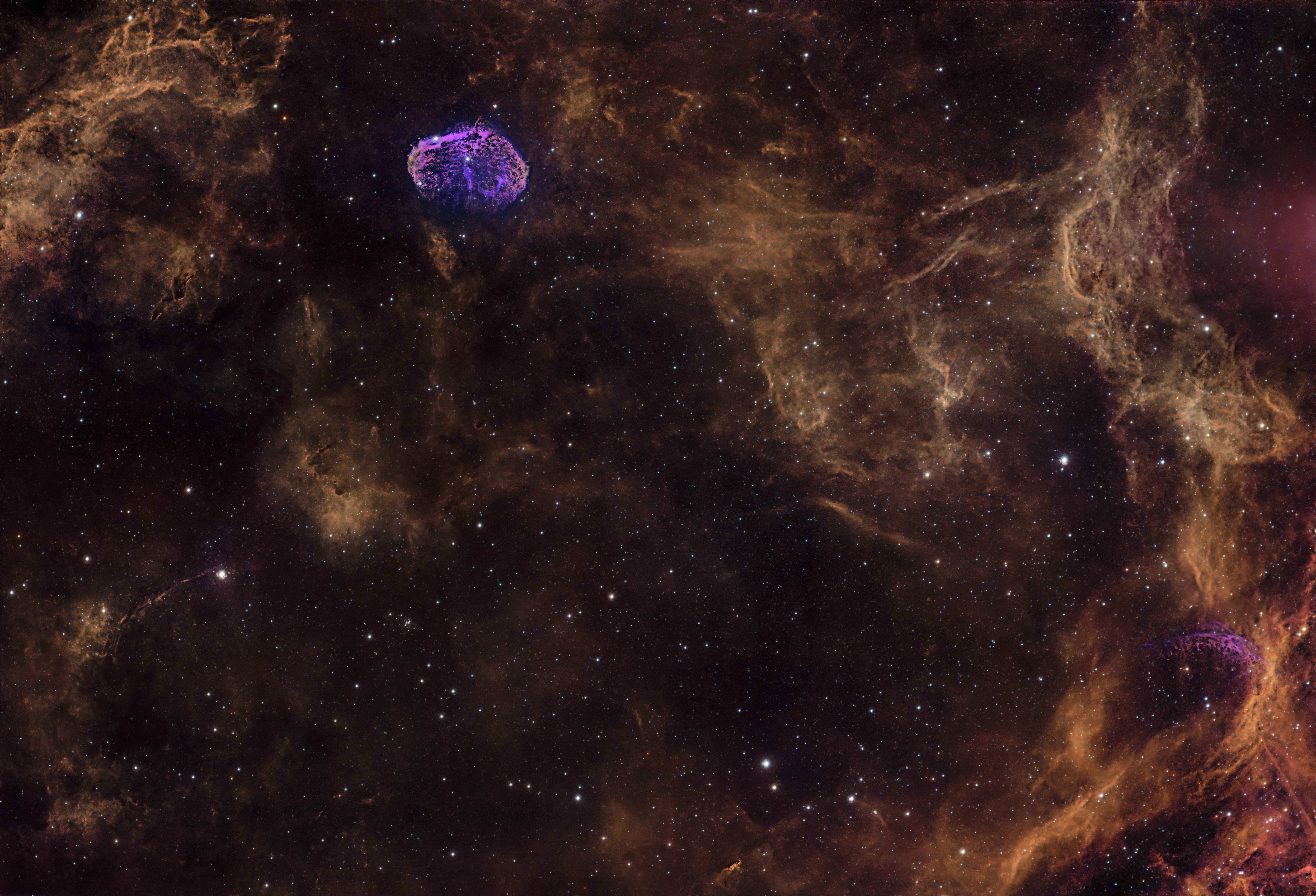 Long ago, in a galaxy far away, a massive star (even as stars go) convulsed and shed its outer shell, sending a shockwave that carried plasma, gas, and other material with it. The star followed up by constantly bombarding its environment with radiation. The shell began to emit its own light, which eventually was collected in the lens of my Redcat 71 on the roof of my garage in Newport. 60 1-minute broadband exposures and 60 5-minute narrowband exposures later, I present NGC 6888: The Crescent Nebula and its native habitat.