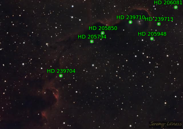 IC1396A is the designation for the Elephant Trunk Nebula: a dense cloud of ionized gas that has been compressed into a round shape from opposing forces of a massive star and several younger stars. The larger star illuminates the edge of the cloud and provides contrast for the trunk that curls at the end of a long column of interstellar dust. It is believed this compressed gas is forming into protostars.