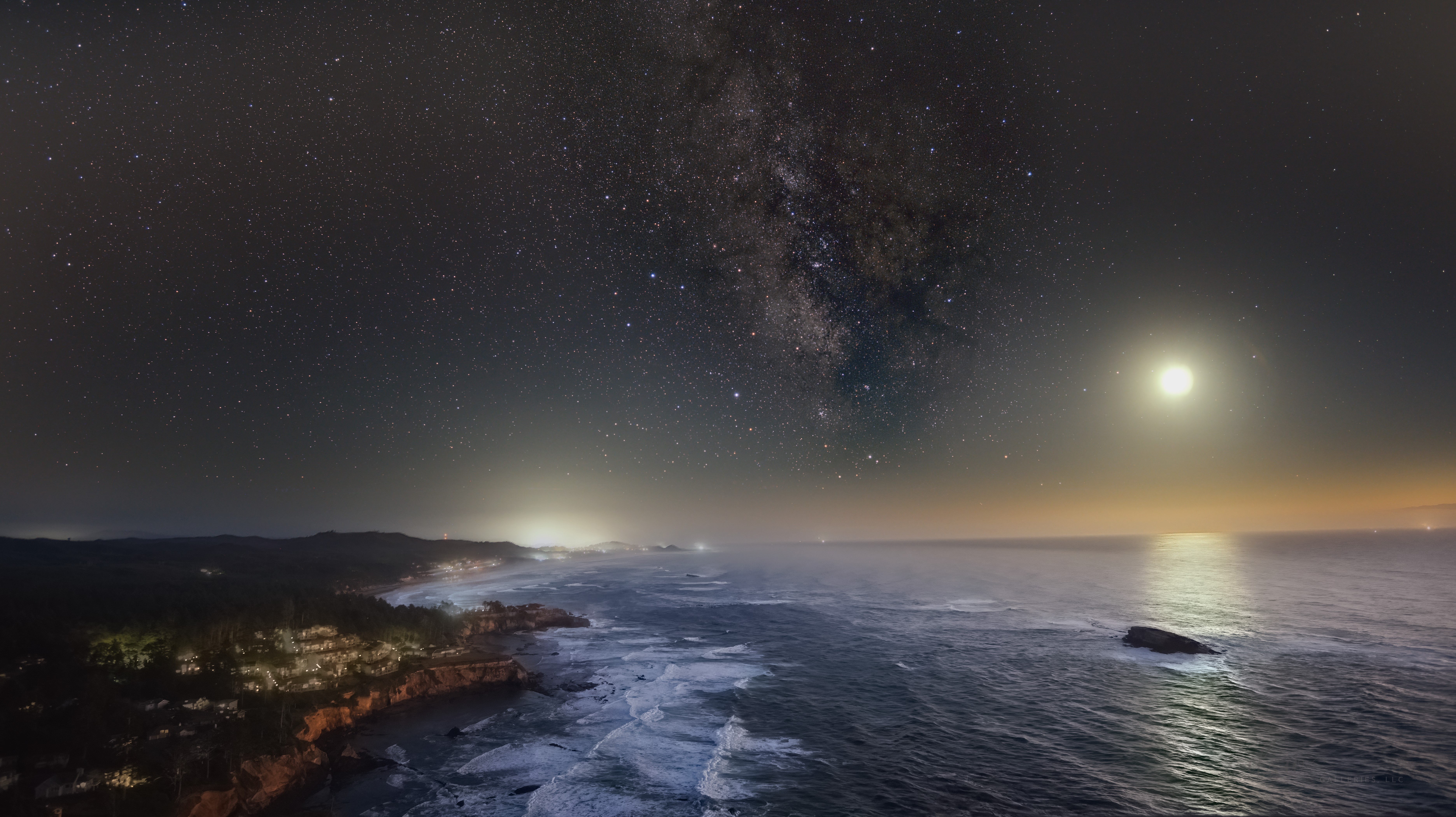 Taken from the Otter Crest Lookout on Cape Foulweather. From the vantage point several hundred meters above sea level, you can look out across the Pacific Ocean and down the Oregon Coast. I spent an evening there capturing images as the sun set and the bright crescent moon slid across the horizon to illuminate the water and the prominent outcrop known as 'Gull Rock.' I was able to capture the Milky Way despite its proximity to the moon. The buildings in the lower left are part of the Inn at Otter Crest. The first outcrop is a viewing area at the Inn at Otter Crest, and the more distant one is called the Devil's Punch Bowl. The glow you see on the horizon at the edge of the coast is the city of Newport. The glow farther inland is from the city of Toledo. The bright moon made processing interesting. I decided to use one exposure for the land and ocean details (1/45th second at ISO 400 taken earlier) and five 6-second exposures at ISO 4000 for the sky details. I stacked the longer exposures twice: once at full frame, then a second time cropped to just the stars and Milky Way to avoid the saturation caused by the moon. I stacked those together to produce the final result. This is a re-process of older data.