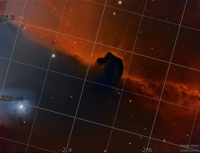 I spent several evenings imaging this target to bring out the detail that surrounds the horse, including wispy filaments of interstellar dust and the rippling red curtain behind it.