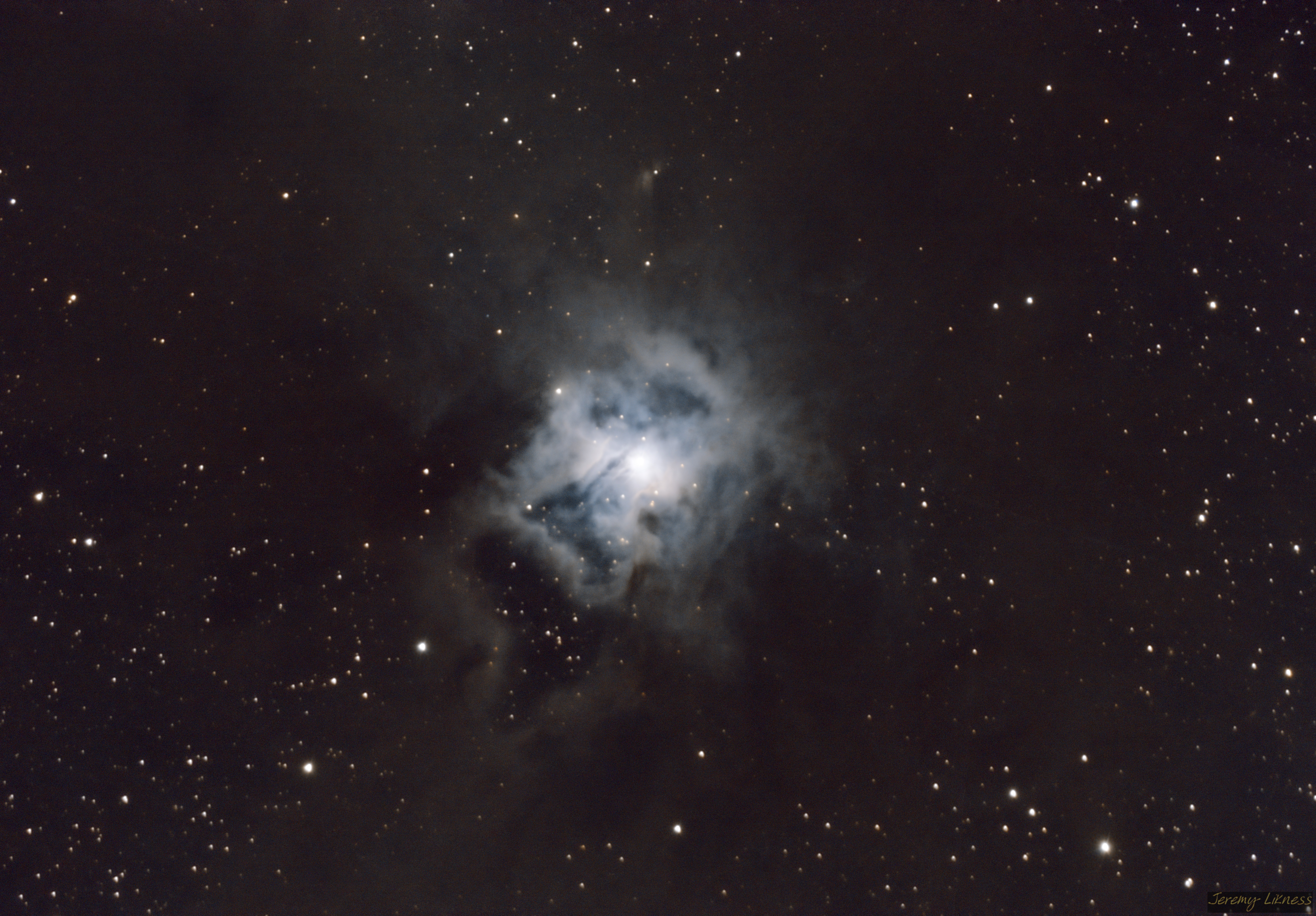 The Iris Nebula is a beautiful reflection nebula lit from behind by a bright star. Although the beautiful blue core is easily visible even with regular camera lenses, it takes dark skies and long exposures to bring out the subtle ripples of dust that appear to expand from the center.