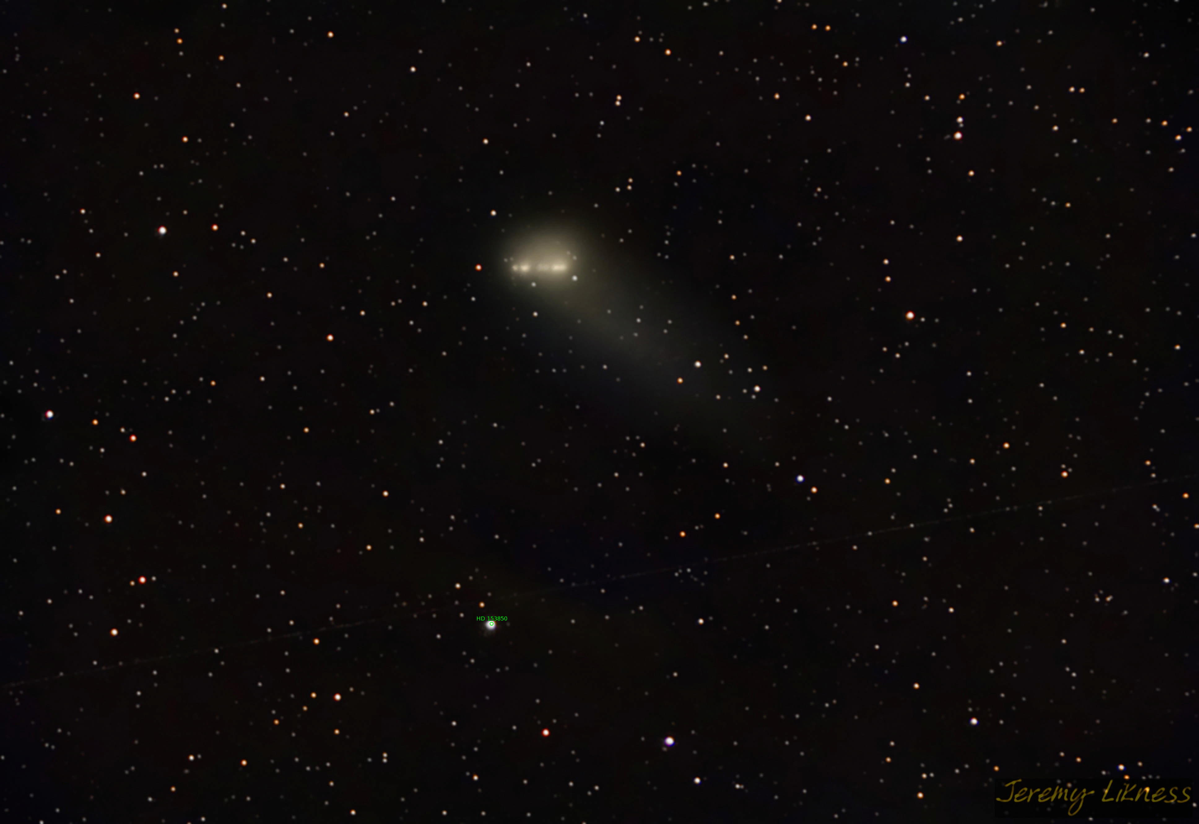 C/2017 K2 (PanSTARR) is a comet discovered around five years ago. It is notable for the amount of activity it exhibited despite being so far from the sun. It is at its brightest from Earth this week at a distance of 'just' 270 million kilometers. When it reaches its closest distance to the sun (perihelion) it will be closer to Mars and less visible. This image shows the superimposed core arcing across the sky for about 30 minutes.