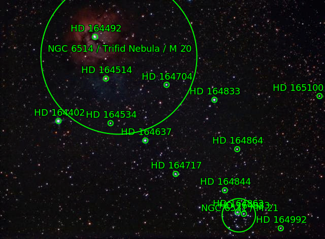 M20 and M21: Trifid Nebula and Webb's Cross