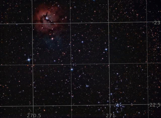 This is a specially framed capture to grab two Messier objects, one of which is a cluster, reflection nebula, emission nebula, and dark nebula all at the same time.