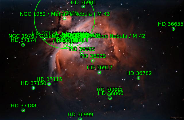NGC1976 M42 The star θ1Ori The star θ2Ori NGC1982 M43 Great Orion Nebula Orion Nebula Mairan's Nebula