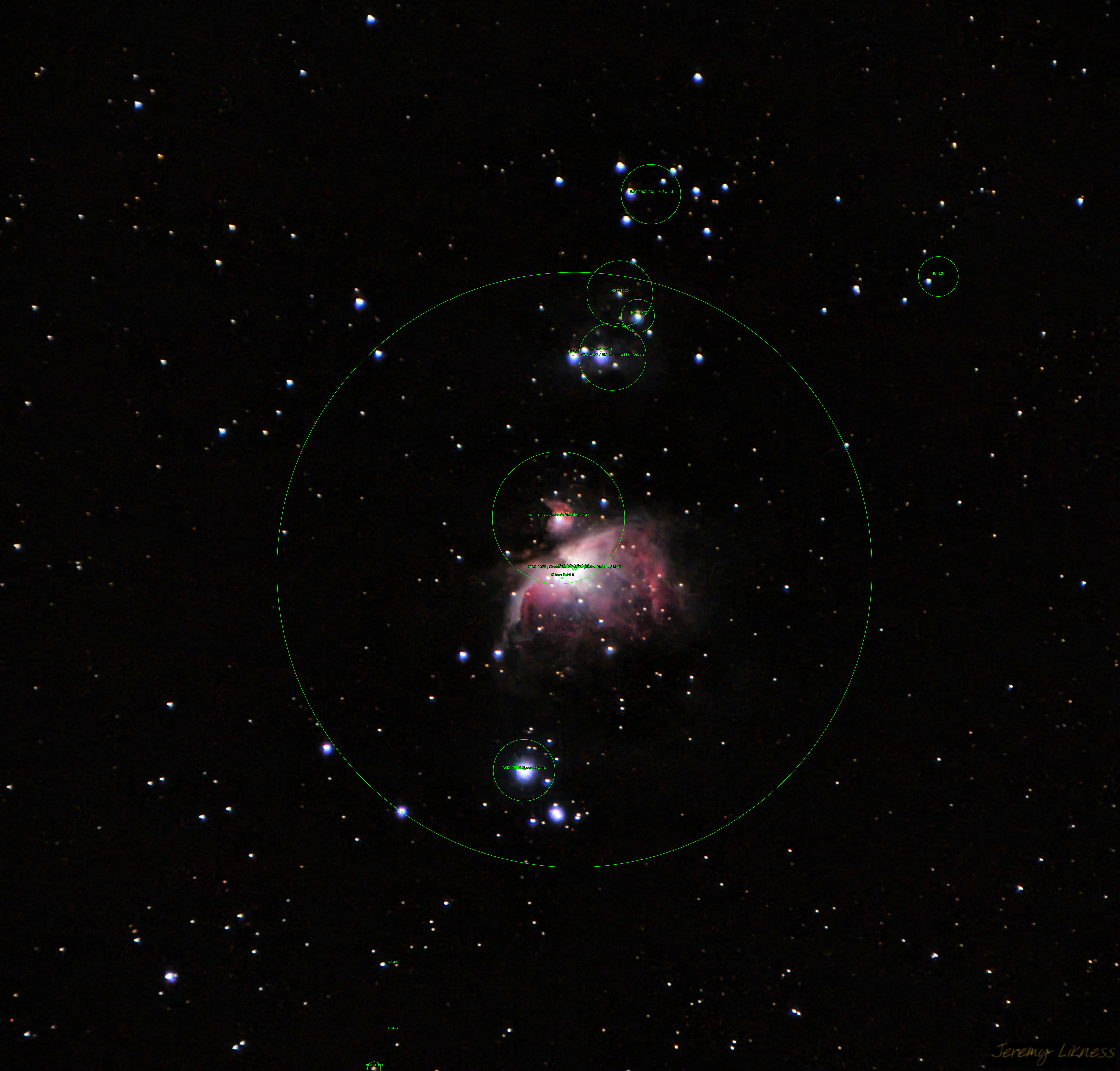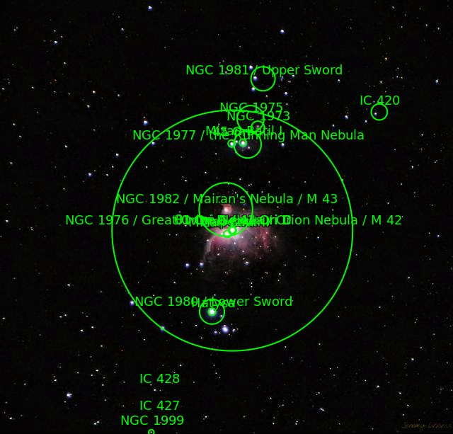 The star ιOri NGC1976 M42 The star θ1Ori The star θ2Ori NGC1982 M43 The star 42Ori NGC1973 NGC1981 NGC1975 NGC1980 NGC1977 The star 45Ori Great Orion Nebula Orion Nebula the Running Man Nebula Lower Sword Mairan's Nebula IC420 Upper Sword