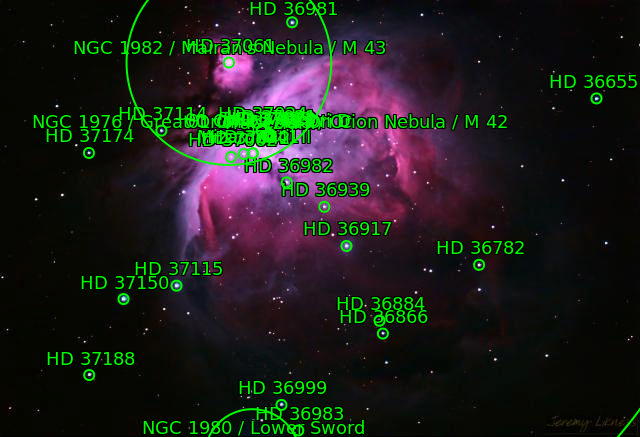 NGC1976 M42 The star θ1Ori The star θ2Ori NGC1982 M43 Great Orion Nebula Orion Nebula Mairan's Nebula