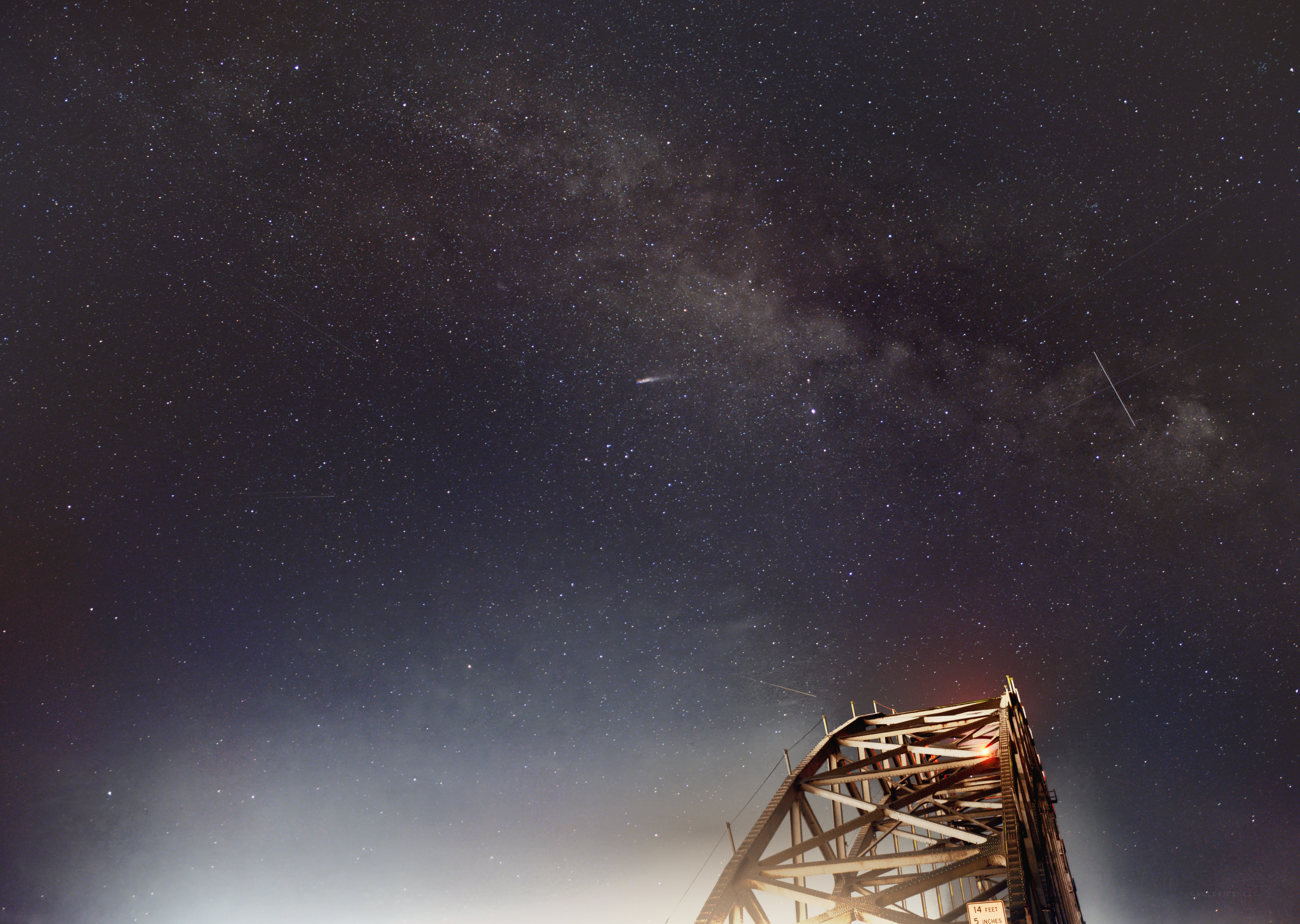 The mass transit of satellites and meteors across the Milky Way above Yaquina Bay Bridge.