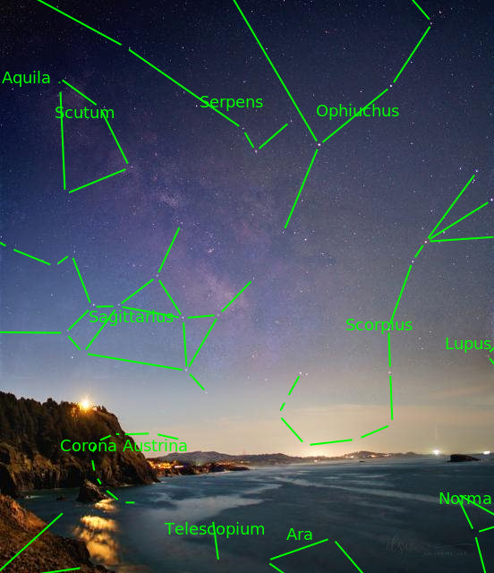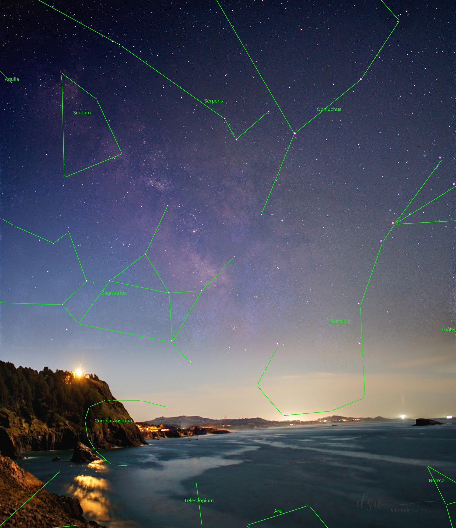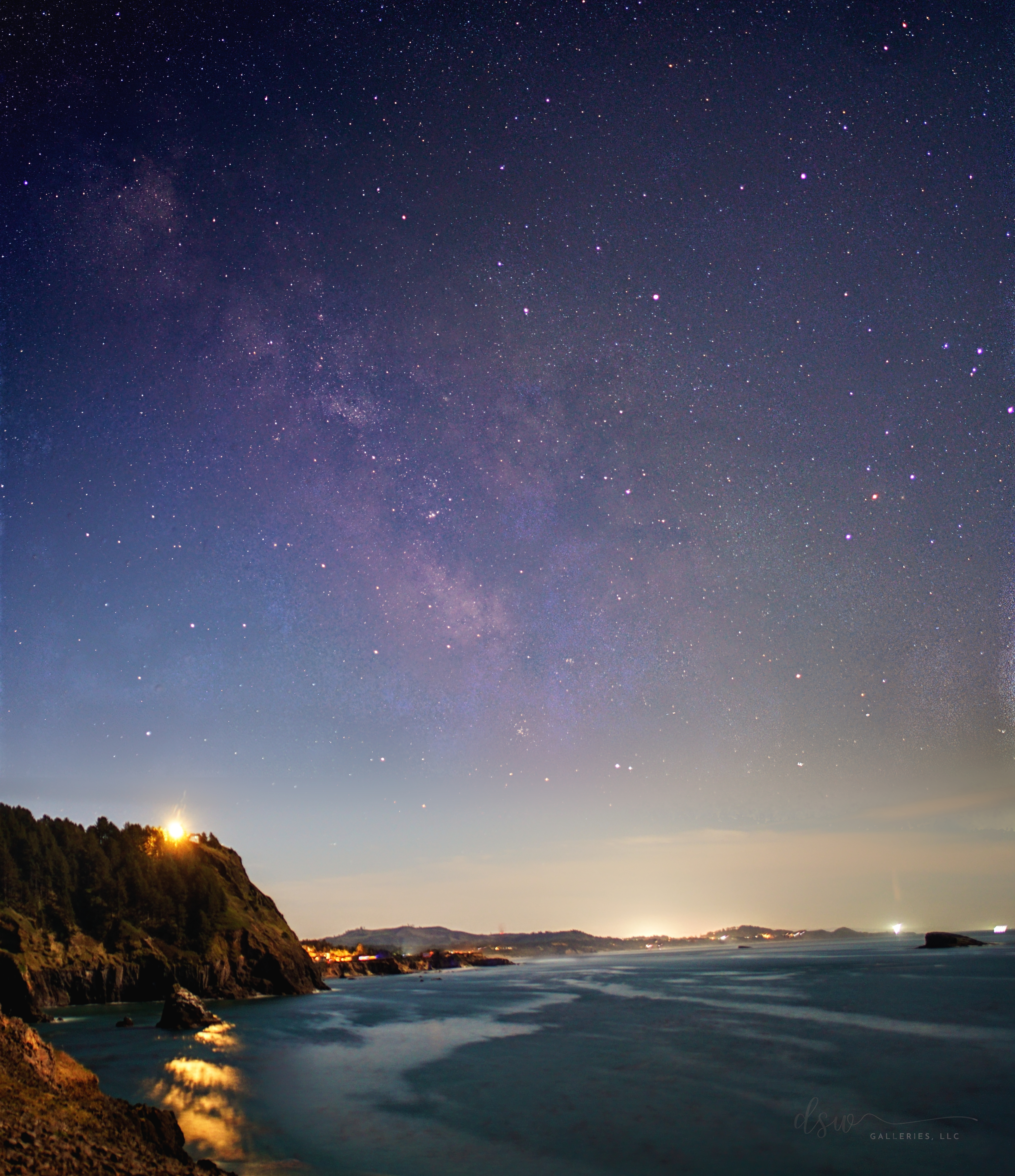 On a night I spent taking photos from a bluff in Otter Rock, Oregon, I was surprised to see the Milky Way lurking above the city lights and behind the light pollution. A single frame captured enough to show it in this picture facing almost directly south looking down the coast and past Gull Rock and the Yaquina Head Lighthouse.