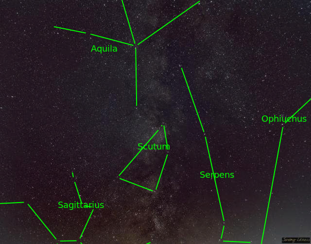 NGC6611 M16 Part of the constellation Sagittarius (Sgr) IC4715 Part of the constellation Aquila (Aql) Part of the constellation Serpens (Ser) The star ηSer The star νOph IC4701 The star λAql The star Nunki (σSgr) The star πSgr The star τSgr The star Cebalrai Cheleb (βOph) The star δAql The star θAql The constellation Scutum (Sct) The star ξSer Eagle Nebula Small Sgr Star Cloud M24
