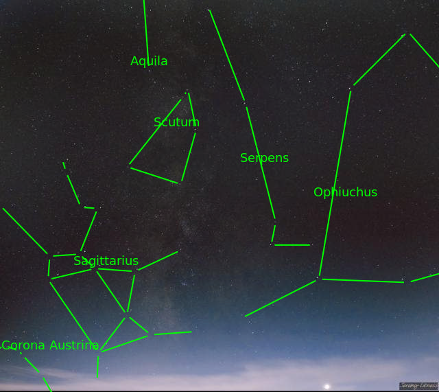 NGC6611 M16 Part of the constellation Sagittarius (Sgr) The star Kaus Australis (εSgr) The star Media (δSgr) IC4592 IC4715 Part of the constellation Serpens (Ser) IC4701 The star Nunki (σSgr) The star Ascella (ζSgr) The star Kaus Borealis (λSgr) The star πSgr The star Rasalhague (αOph) Part of the constellation Ophiuchus (Oph) The star Cebalrai Cheleb (βOph) The star ζOph Part of the constellation Corona Austrina (CrA) The star Sabik (ηOph) The constellation Scutum (Sct) Eagle Nebula Small Sgr Star Cloud M24 NGC6727