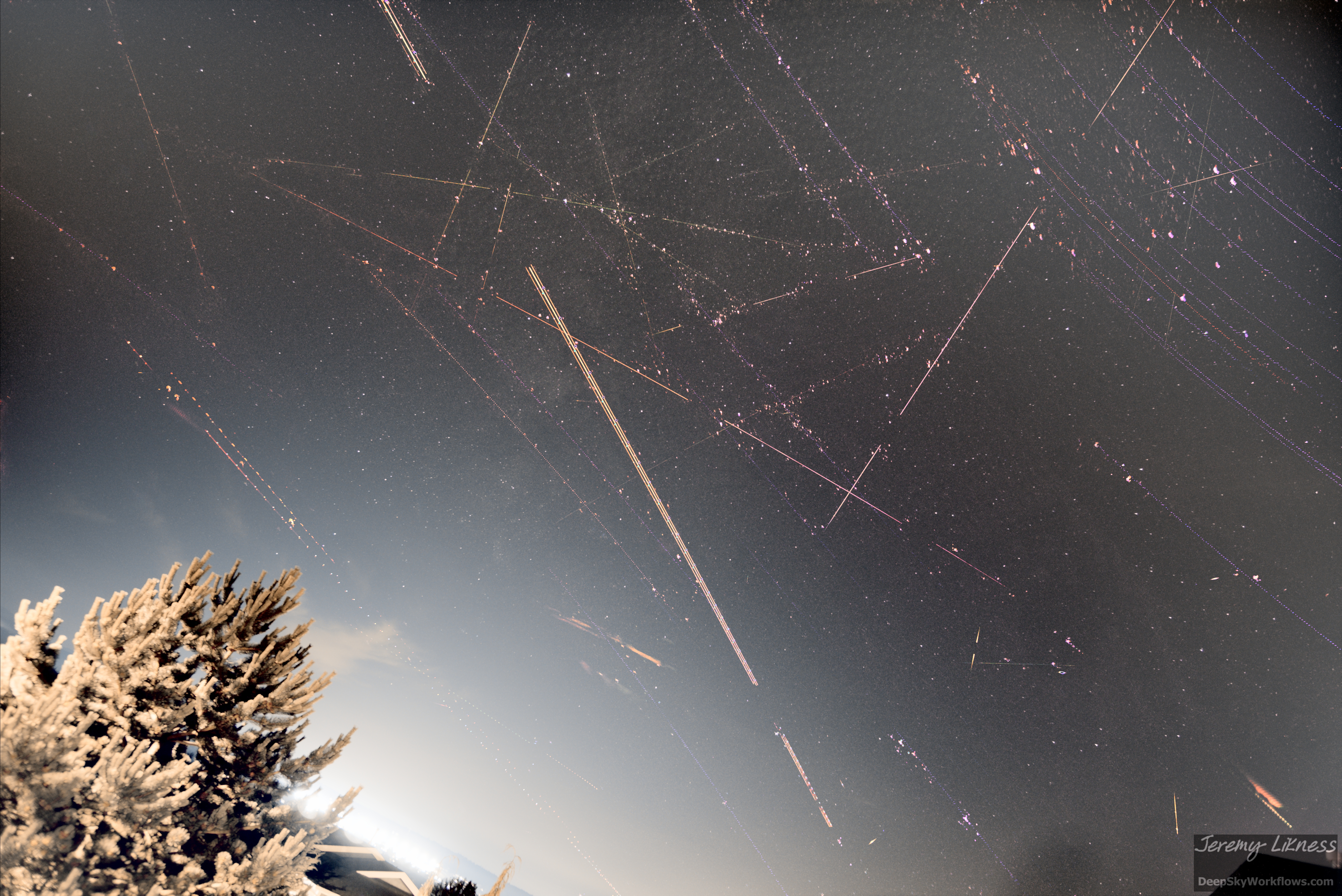 I recently pointed my Samyang 12mm southeast over the glow of downtown Monroe to capture a time lapse from dusk until dawn. I also appreciate this tree for keeping still and helping with framing. This image captures the light trails of the satellites and planes that passed overnight.