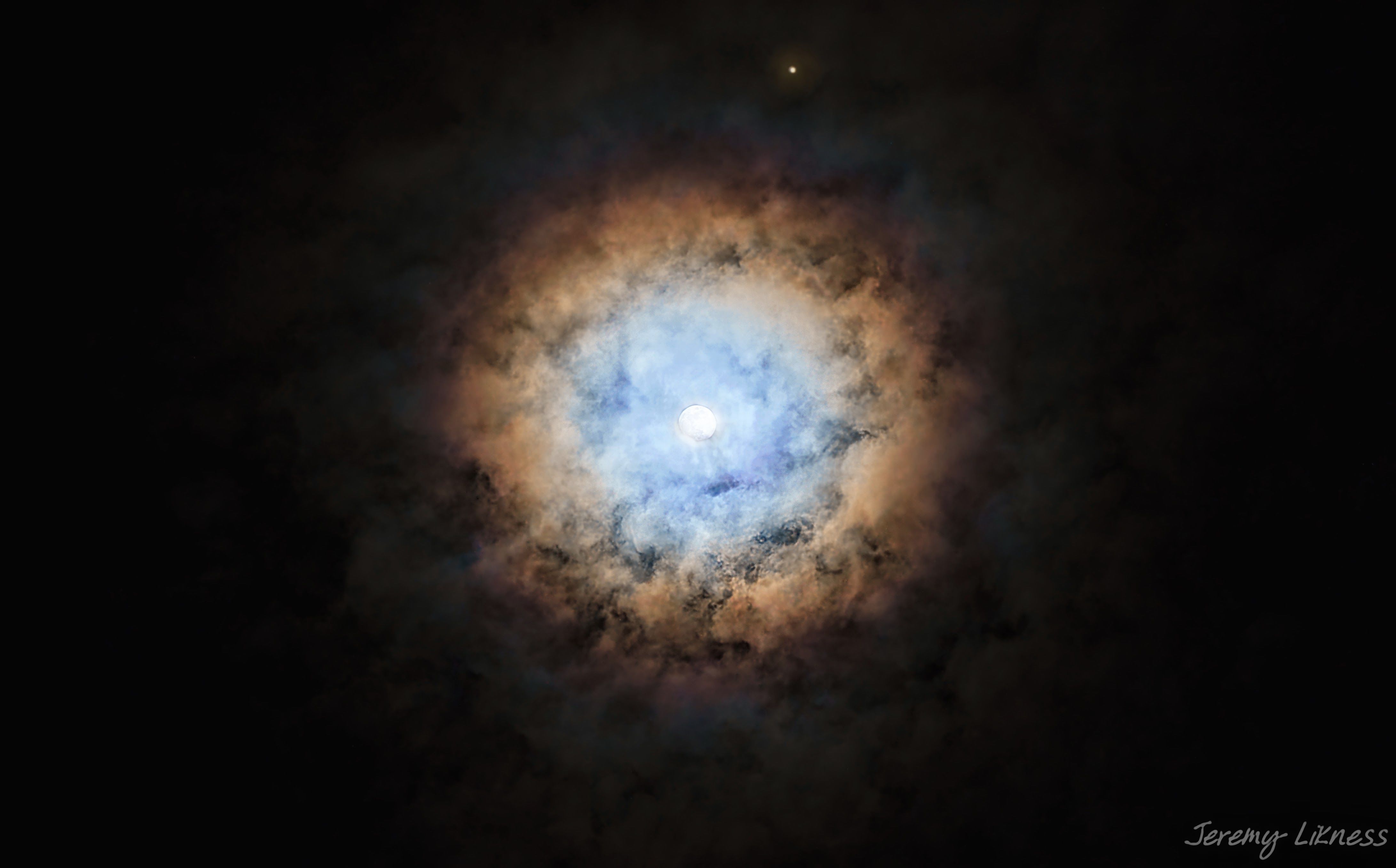 It was a cloudy evening as we kicked off 2023. The moon was near Mars, but the clouds threatened to destroy any chance of photographing them. However, something else happened. The moon created a rainbow-like ring in the clouds and Mars punched through a thin opening. This moonring was created by combining a fast exposure (for the moon detail) with a slow exposure.