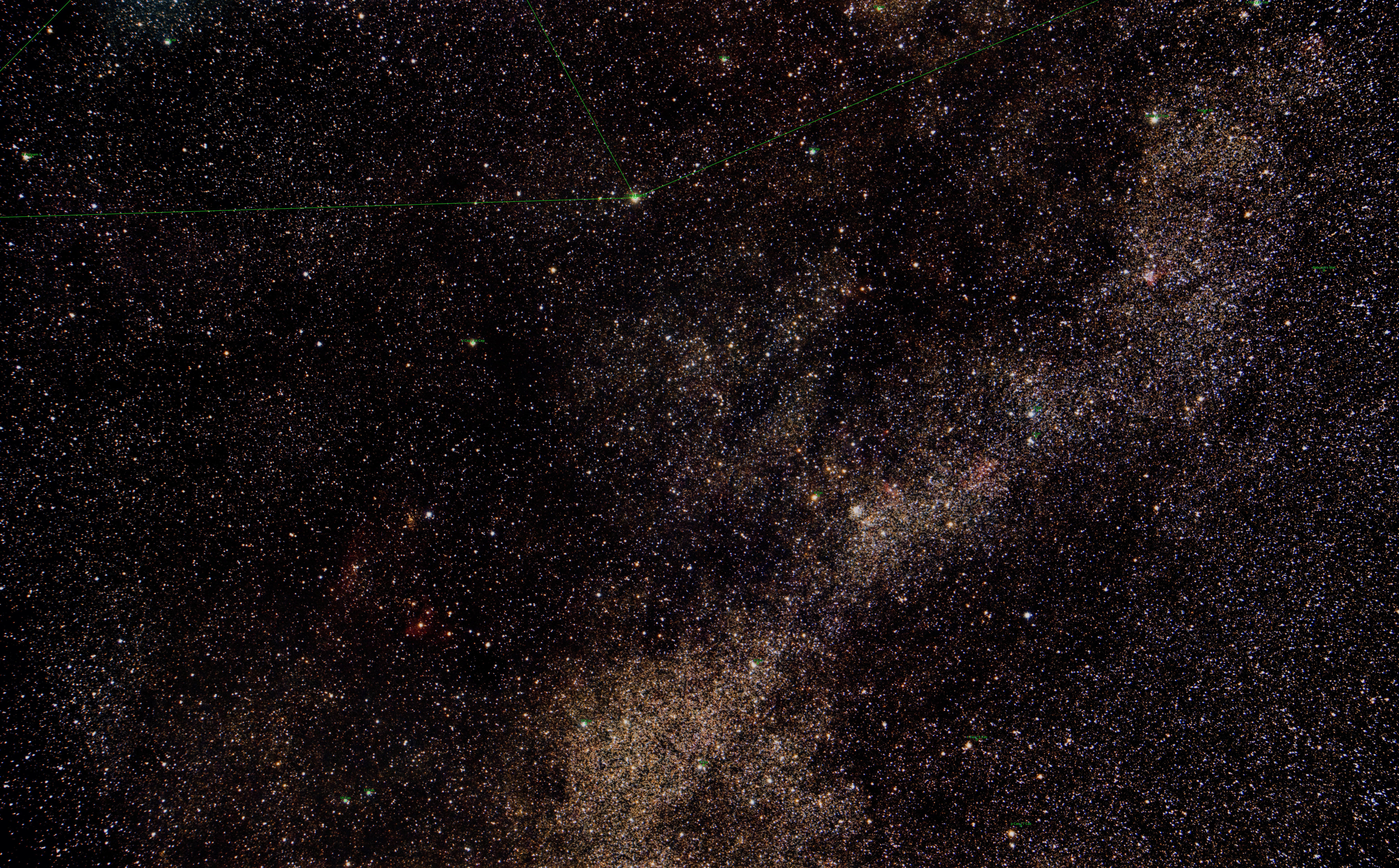Hours of 2-minute exposures using my Sony Alpha 6300 reveal the Milky Way's wall of stars, galaxies, and nebulae that's practically a 'star map' of who's who in common targets. Visible targets include Messier 52 (a cluster), the Bow-tie Nebula, the Bubble Nebula, and the Wizard Nebula. There are several other planetary and diffuse nebulae and galaxies to boot.