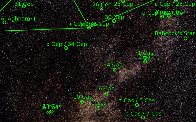 23 Cep 27 Cep 32 Cep 33 Cep 34 Cep 5 Cas 7 Cas NGC7380 NGC7822 The star 1 Cas The star 31 Cep The star 4 Cas The star Al Aghnam II (π Cep) The star δ Cep The star ε Cep The star ι Cep The star ο Cep The star ρ Cas The star τ Cas