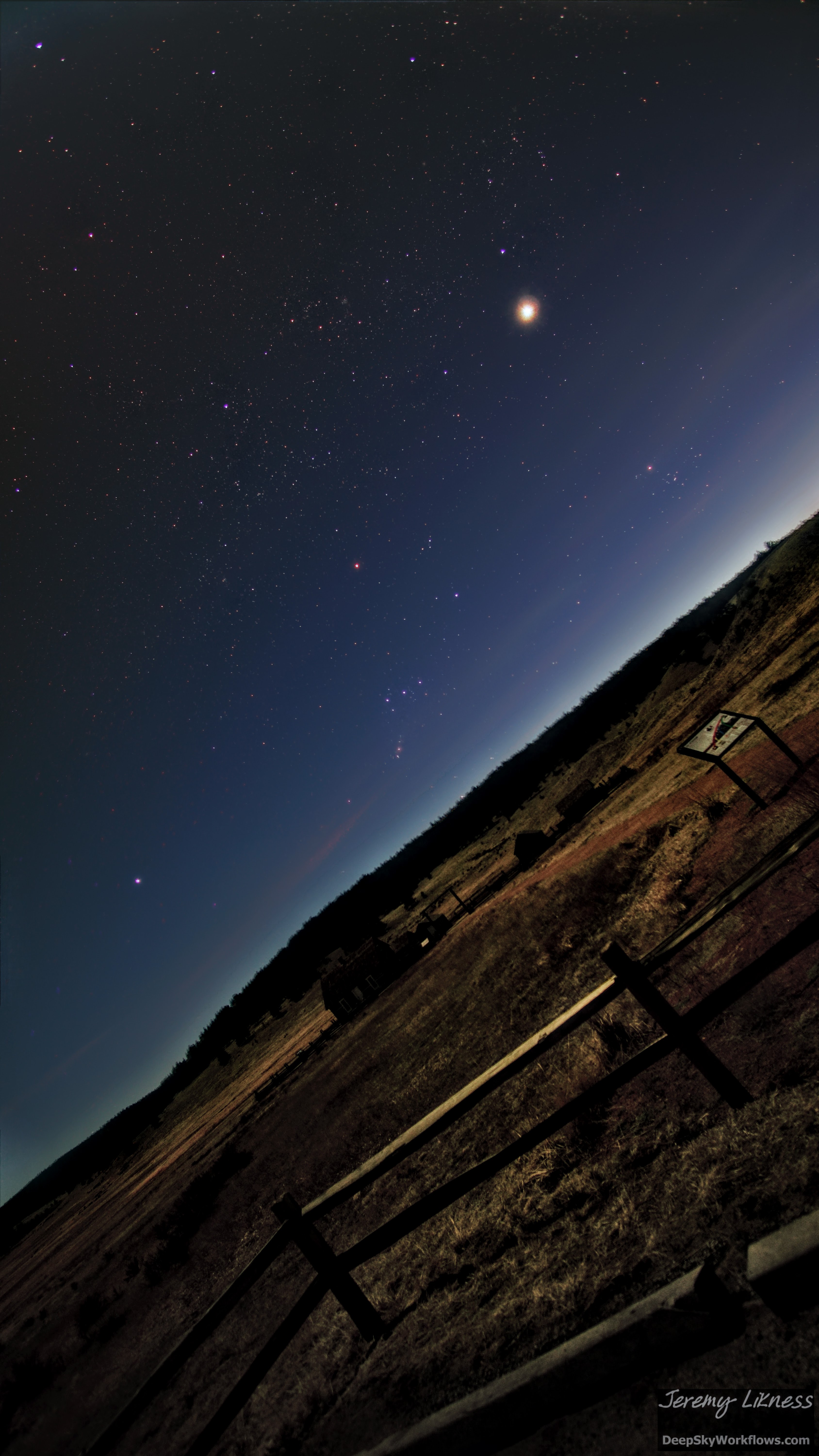 A flaming Venus chases Orion to the horizon behind the Hornbeck Homestead in Florissant, Colorado.