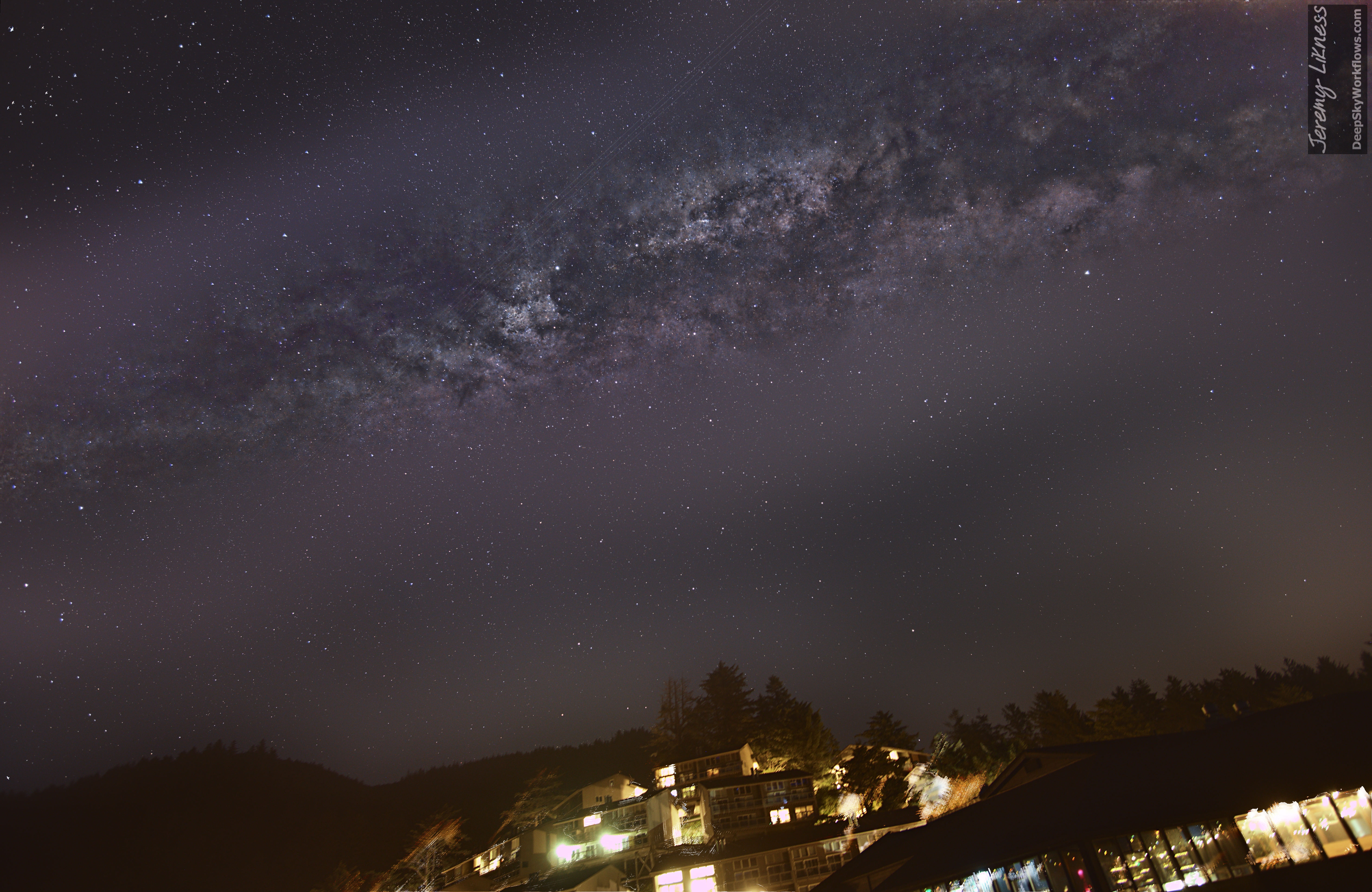 Despite heavy wind gusts and a bright moon just below the horizon, the arch of the Milky Way was clearly visible above the lights of the Inn at Otter Crest facing east from the grassy field.