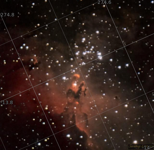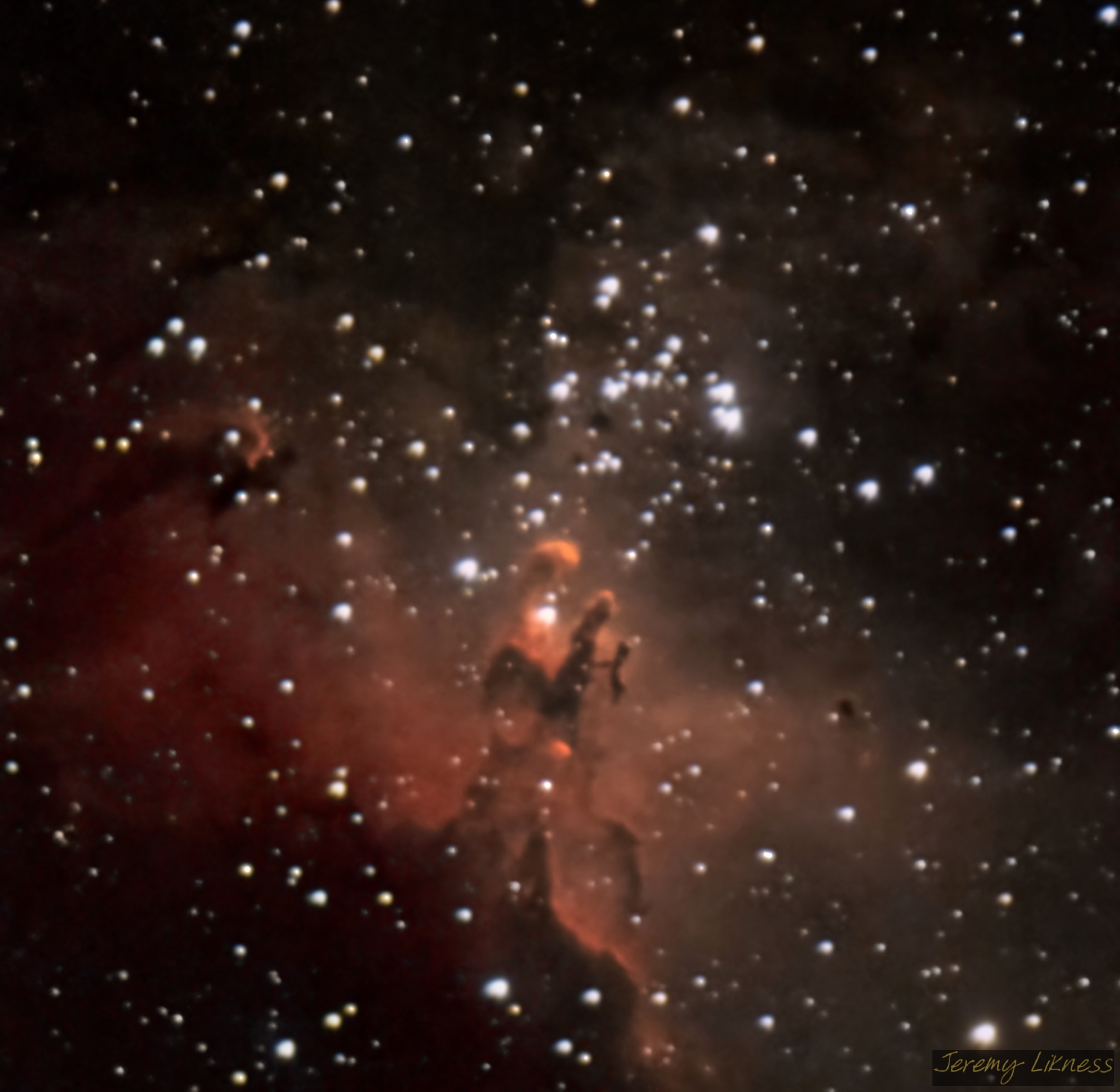 I only spent 30 minutes imaging the heart of the Eagle Nebula (M16) commonly known as the Pillars of Creation. This shot is a combination of RGB and Hydrogen alpha.