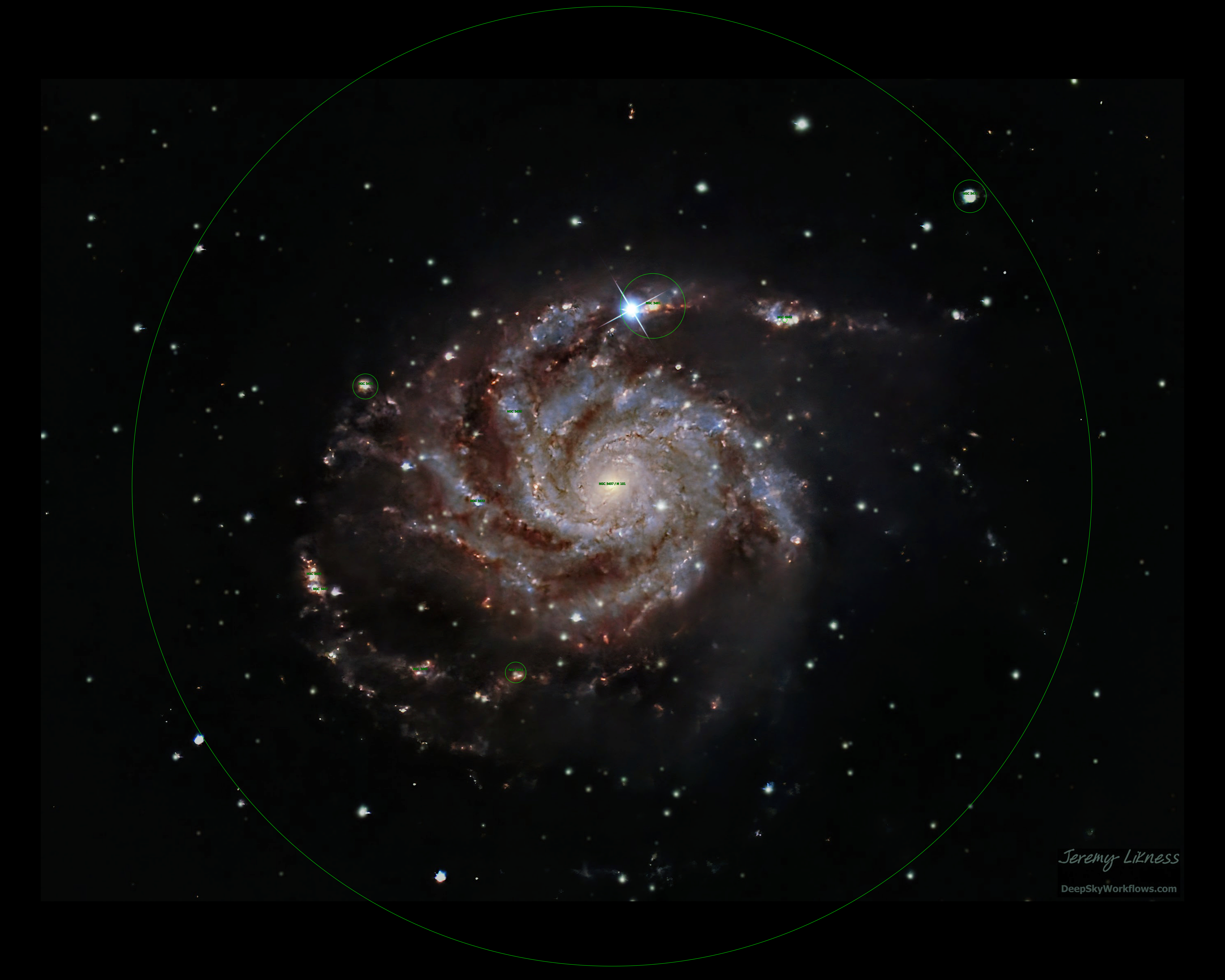 A few weeks ago, supernova SN 2023ixf was discovered. A massive star ran out of fuel and violently collapsed, causing a brilliant explosion that can be clearly seen 21 million light years away. It is the closet supernova to earth in the past 5 years and 2nd discovered in the area in the past 15 years. Messier 101, Pinwheel Galaxy, with supernova visible top middle.
