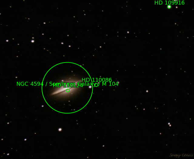 Messier 104 is referred to as 'The Sombrero Galaxy.' Can you guess why? This galaxy presents itself edge-on with a bright core and dark dust obscuring the central disk. 45 60-second exposures.