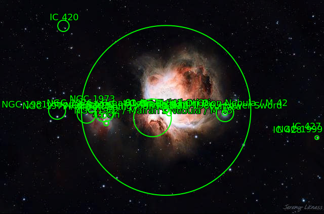 41 Ori A 41 Ori C 41 Ori D 42 Ori 43 Ori 44 Ori Great Orion Nebula IC420 Lower Sword M42 M43 Mairan's Nebula NGC1973 NGC1975 NGC1976 NGC1977 NGC1980 NGC1981 NGC1982 Orion Nebula The star 45 Ori The star Hatysa (ι Ori) The star Mizan Batil I (c Ori) The star Mizan Batil II (θ2 Ori) The star Trapezium (θ1 Ori A) The star θ1 Ori C The star θ1 Ori D Upper Sword the Running Man Nebula