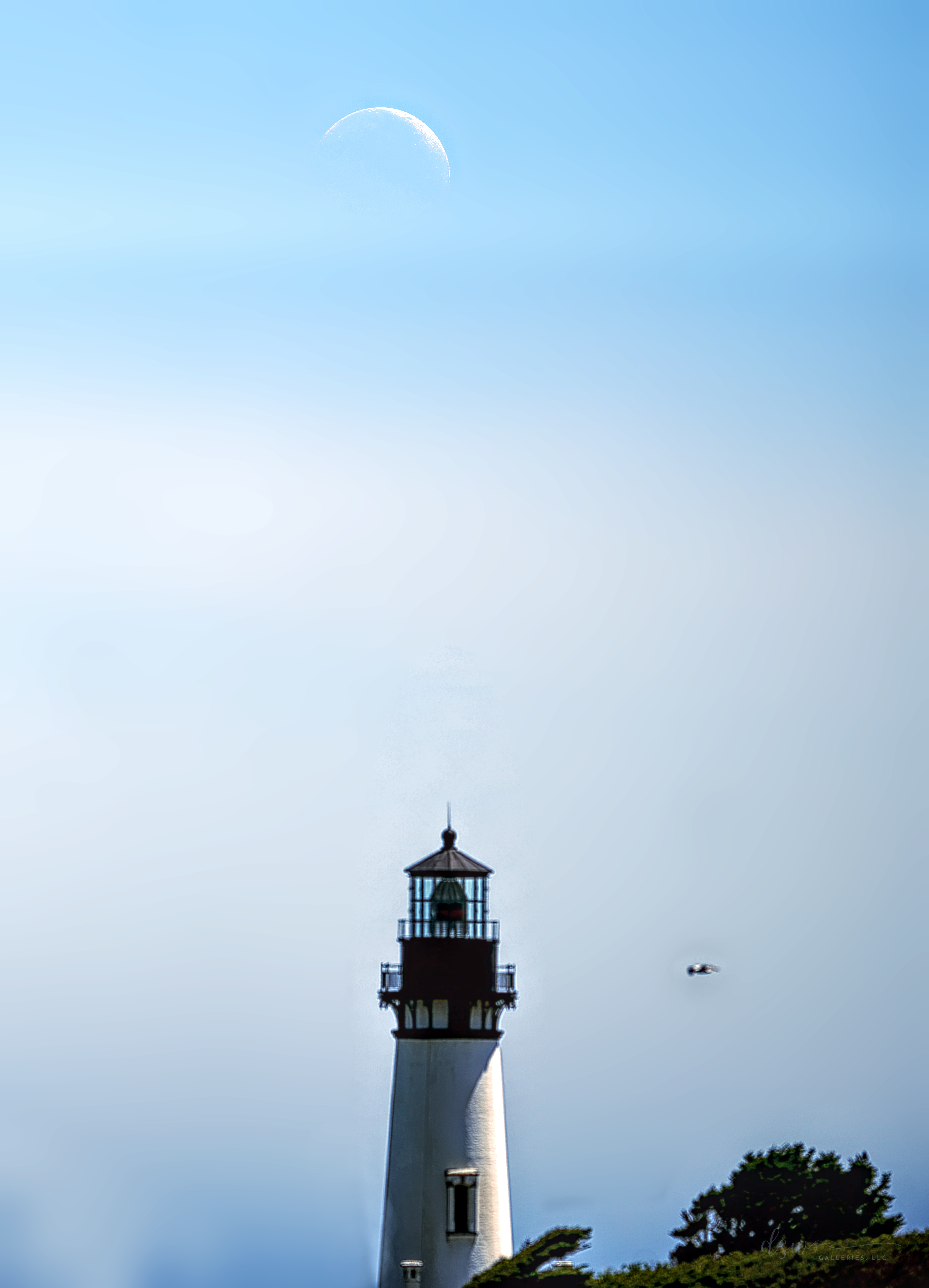 The lighthouse had a friend with this bird and the moon. The moon was supposed to descend to almost to touch the lighthouse, but began to disappear when it hit a bank of low-lying clouds and fog.