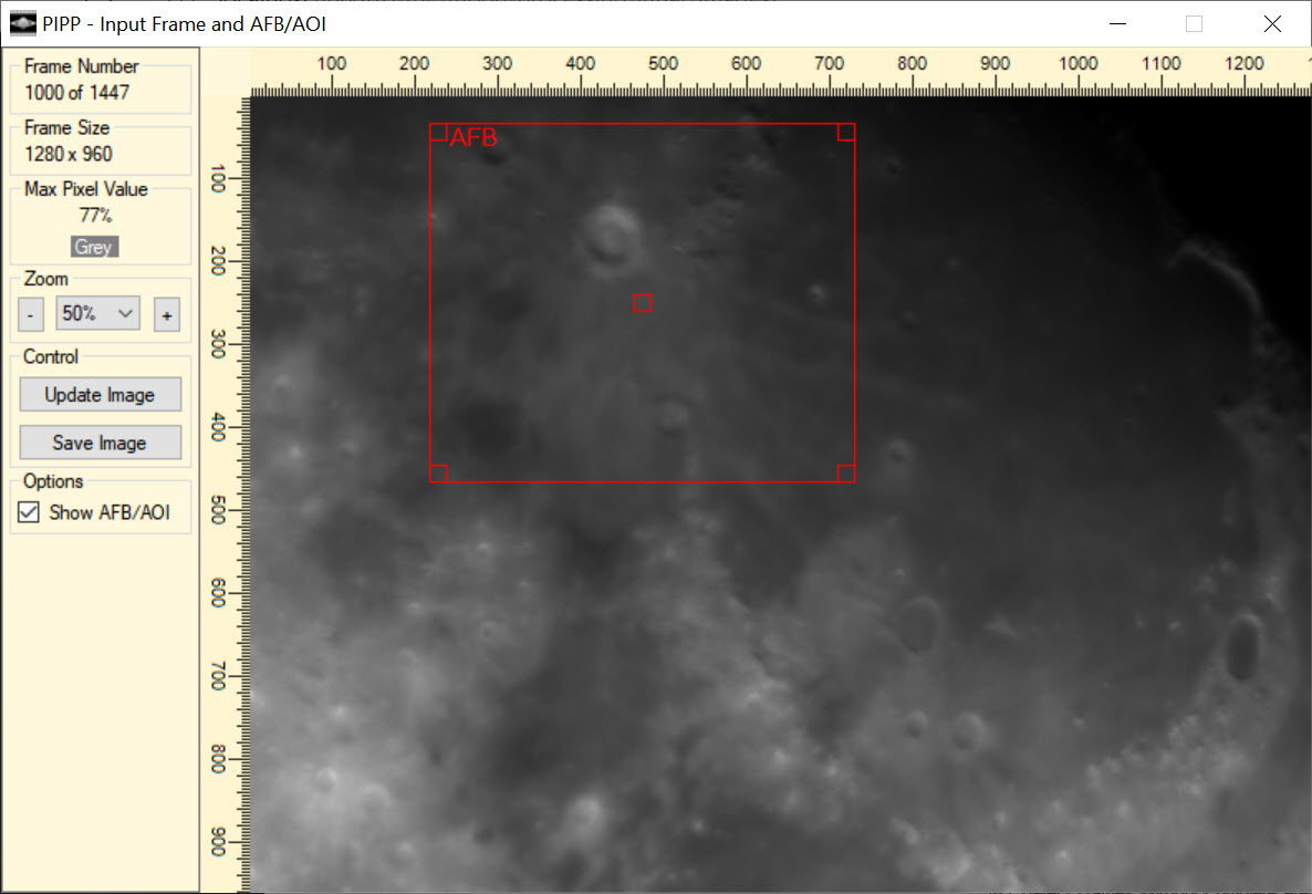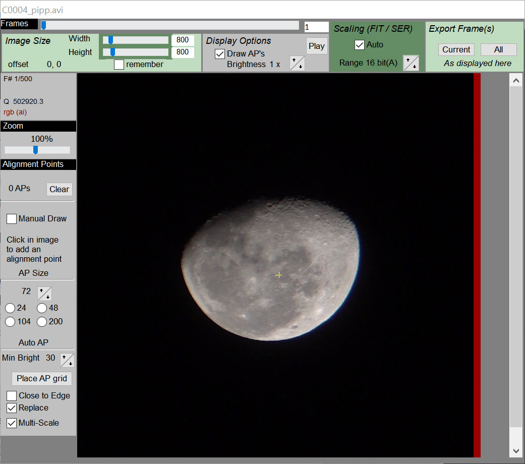 First, we open the source. For this example, I choose the AVI file that was processed from my camera video. A new window pops up with a single frame. The purpose of this step is to draw boxes around features that will help align the various frames together for stacking.