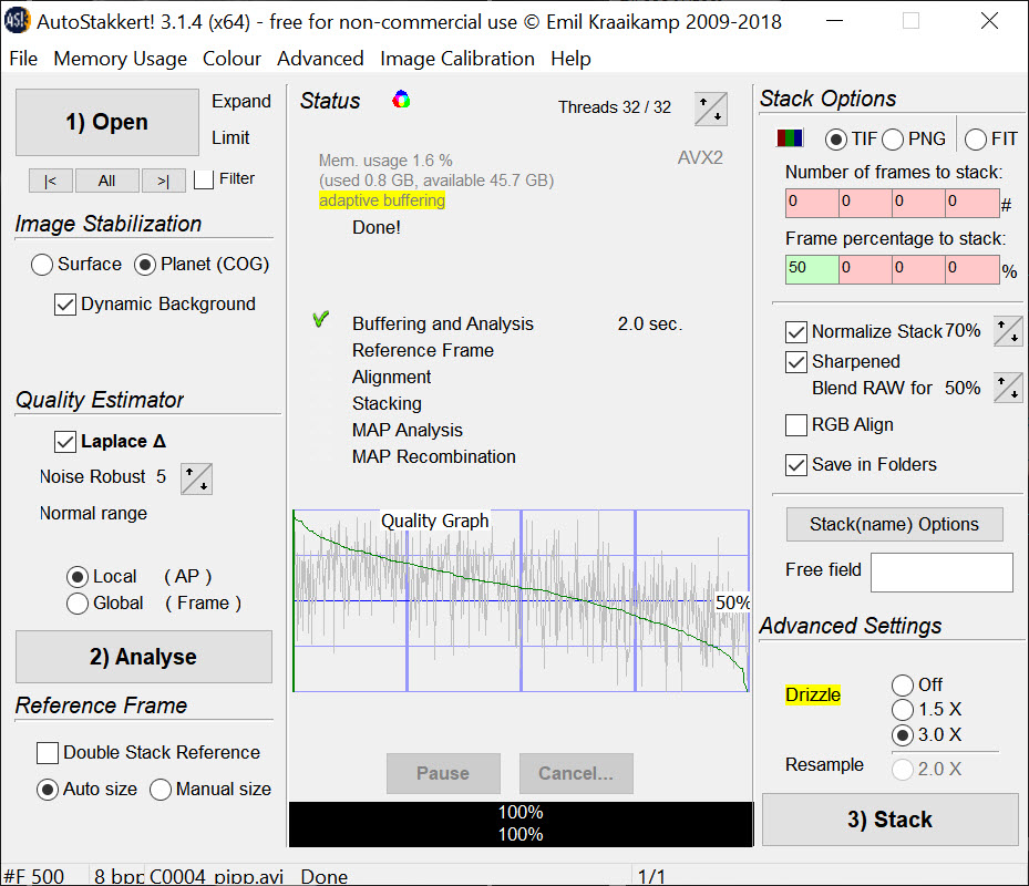 In the original window, you can now click “Analyse” to get a quality graph. I already trimmed the bad images pre-processsing so the graph looks good. I’ll stack 75% of the remaining images and normalize the stack. Because the image is so small, I’m going to beef it up using a 3x drizzle. This will work well because I used video that moved around to shift or “dither” the pixels. Here is my dialog just before clicking “Stack.”