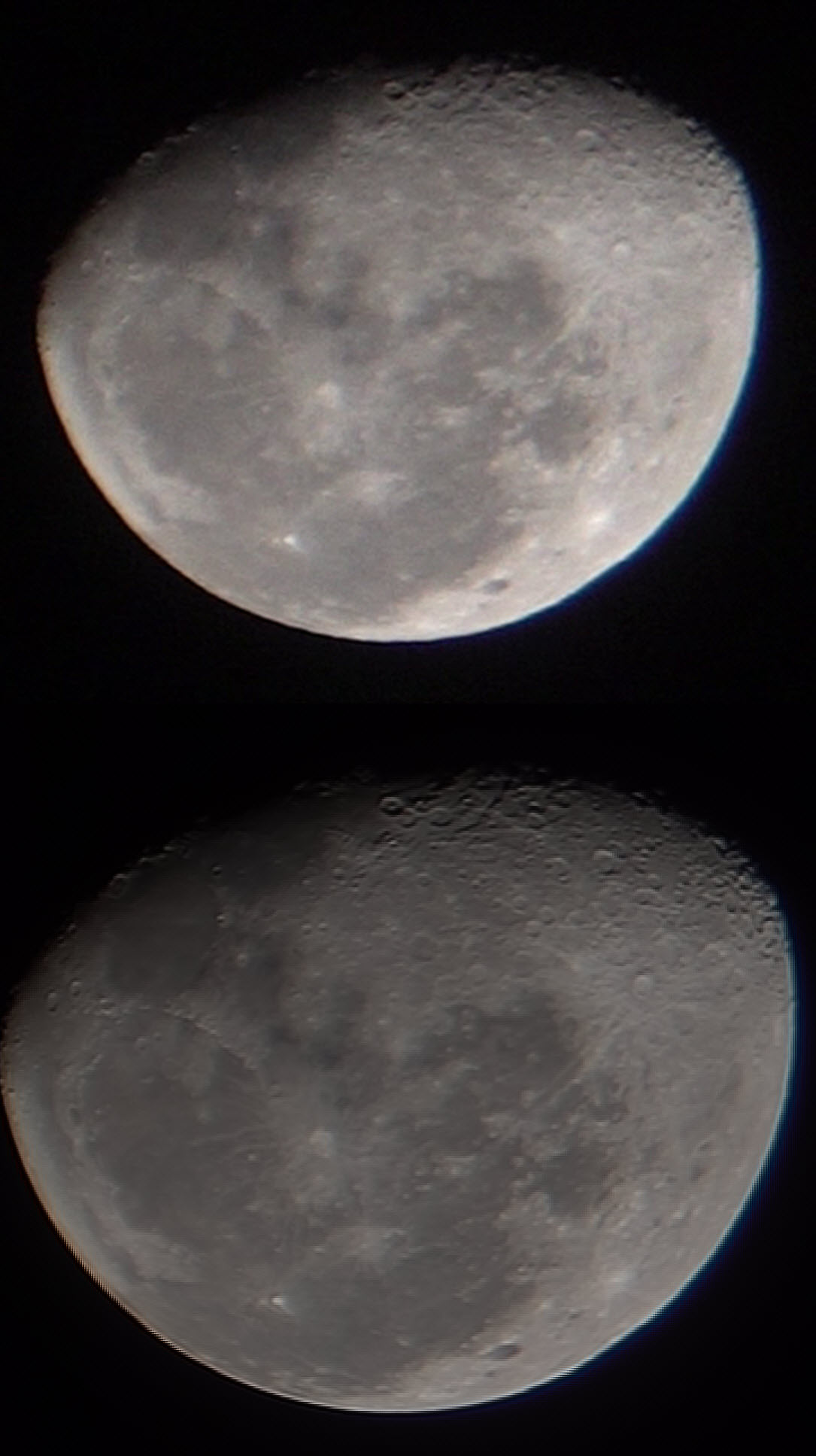 After stacking, a new file is generated that is ready for processing. Here is a comparison with a single frame from the camera on top and the stacked version on the bottom.