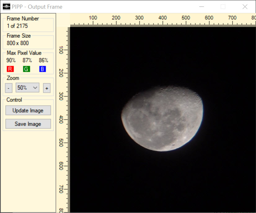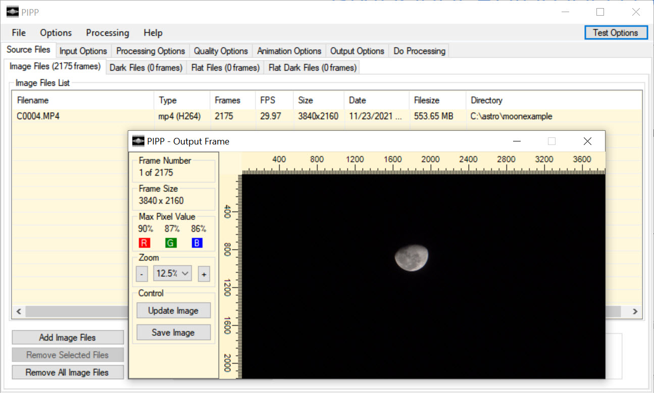 My main “go to” for planetary and lunar pre-processing is the venerable and free Planetary Imaging PreProcessor (PIPP). It can take either videos (including the SER format) or individual images. You specify the type of image you’re after (such as the full planet, a close-up of its surface, or an animation) and tweak some other controls, and PIPP goes to work prepping your images. Let’s take a look using our three sources.