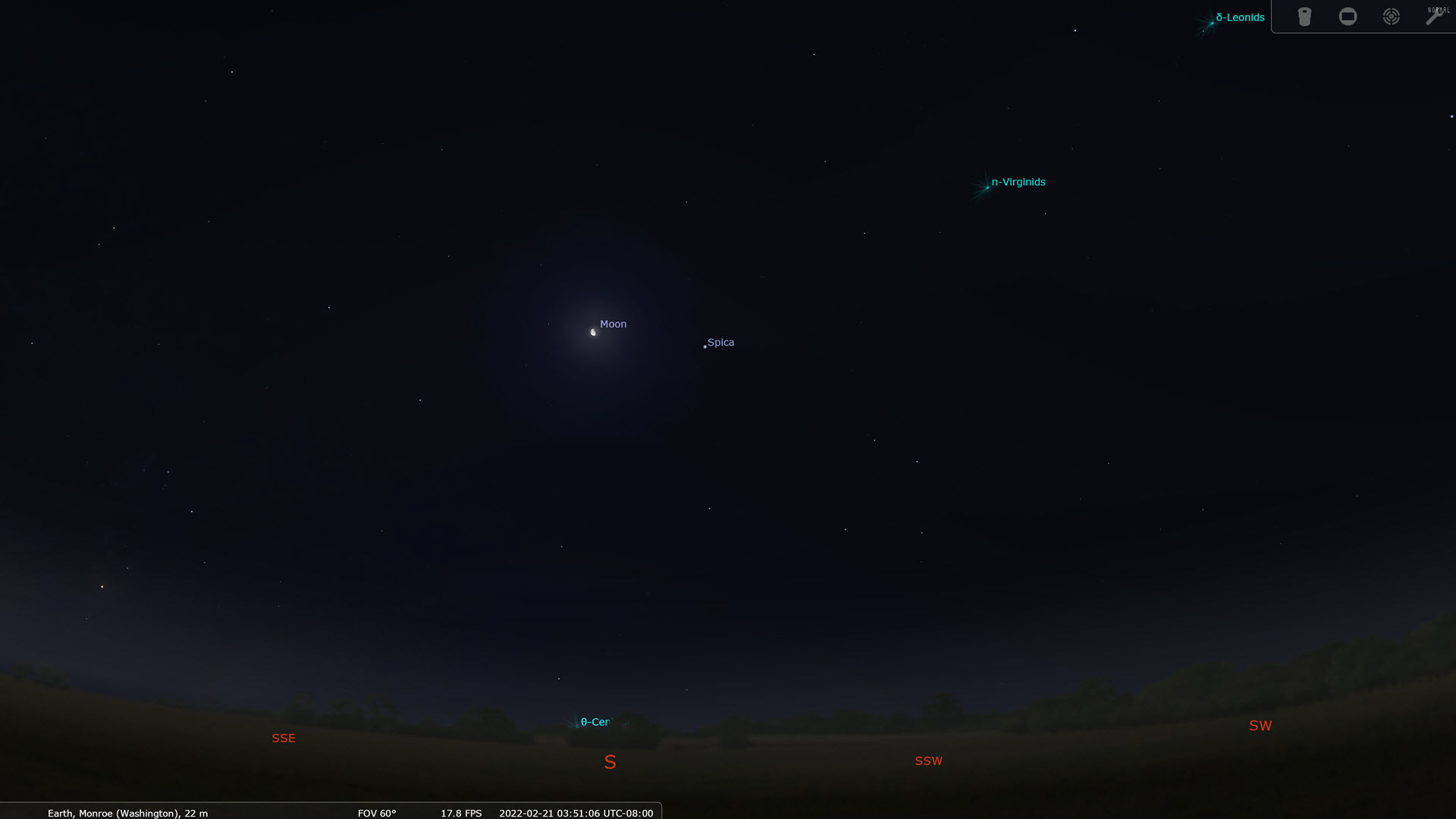 Stellarium is one of my most commonly used pieces of astrophotography software. The reason is simple: it allows me to look at the stars even when it’s cloudy outside! It has a lot of great features built-in. For example, you can choose to view the sky as it will be at a future date. Here, I can see the moon will be fairly high in the sky at 3am tomorrow morning.