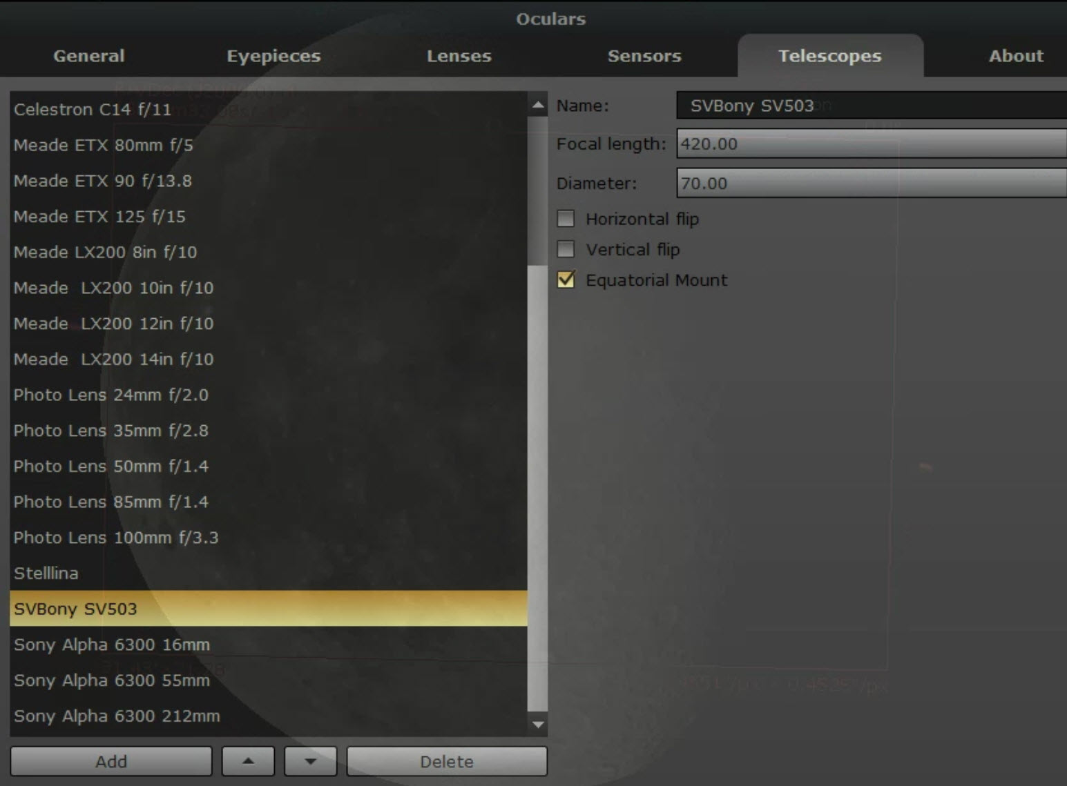 What I really love is the ability to enter information about your equipment. For example, this is my set of entries for my Svbony doublet refractor with a ZWO ASI294MC Pro camera.