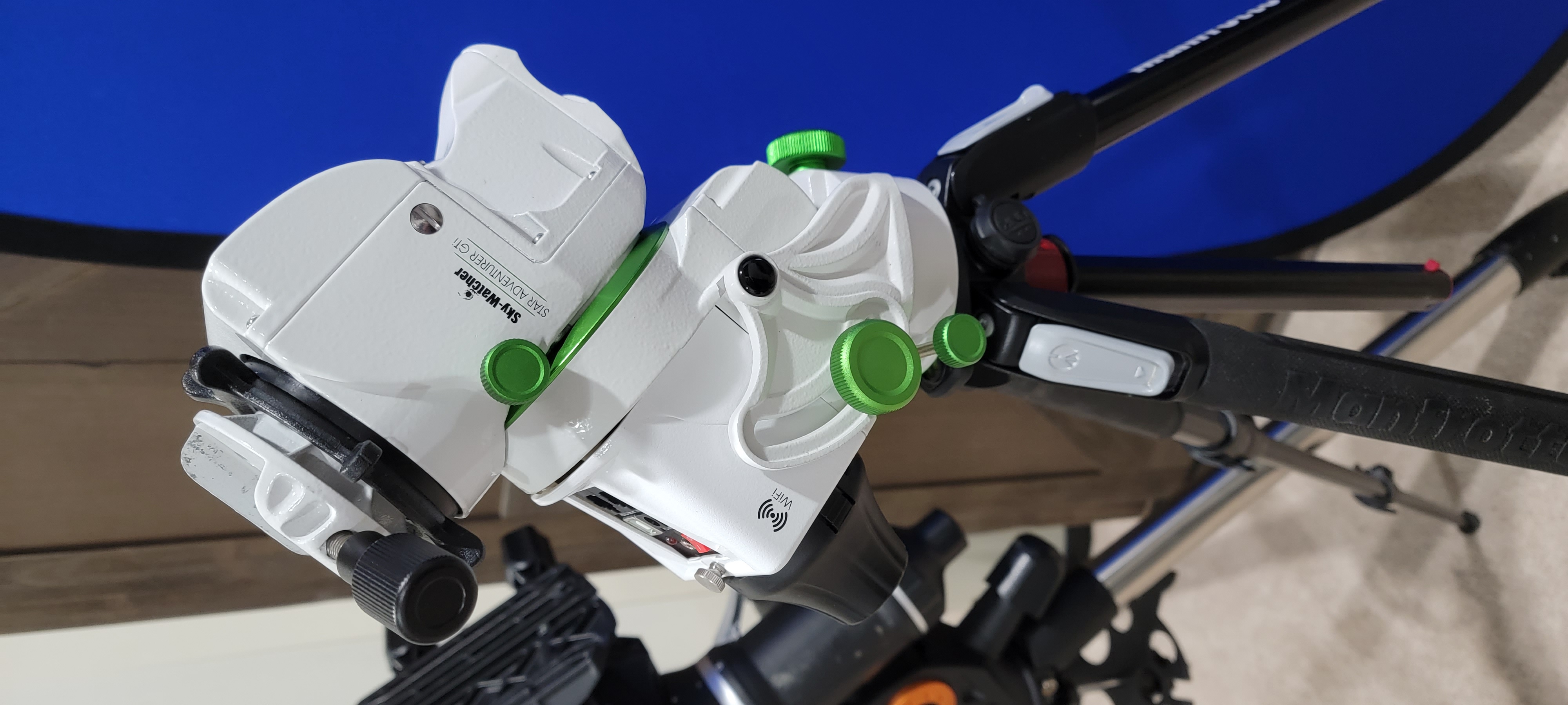 This is a very portable system that performs well. I’ve loaded it to its 11 pound (5kg) capacity and had it track accurately for 5-minute exposures in a completely battery-powered setup. All of the sky images taken in my Cayman collection used this mount including this image of the Andromeda galaxy.