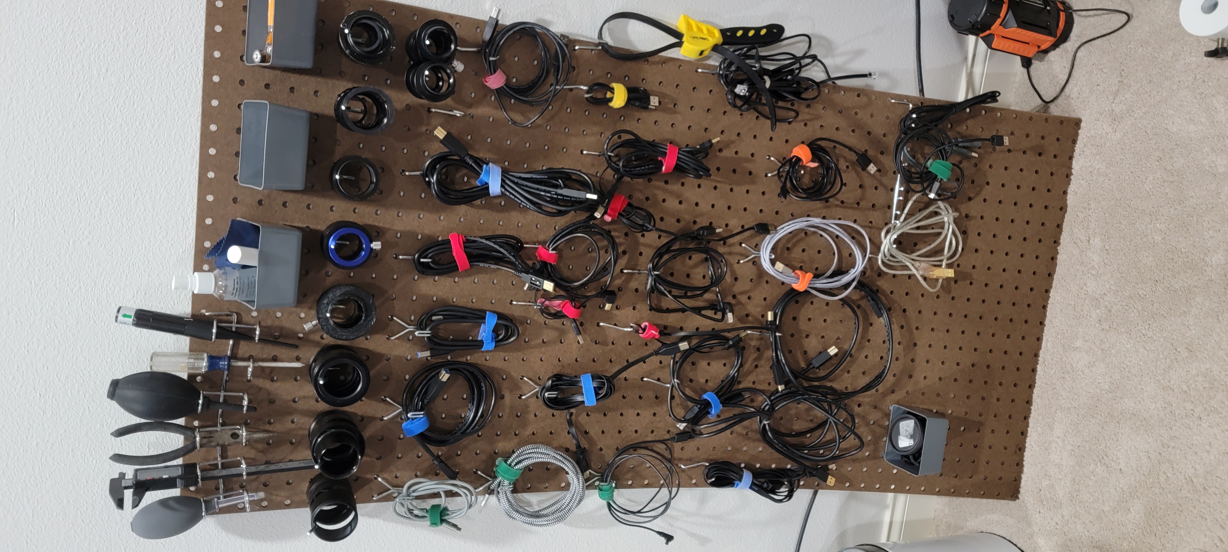 The pegboard revolutionized how I keep track of my astrophotography gear. I picked one up at a local home improvement store and purchased a variety pack of pegs online.