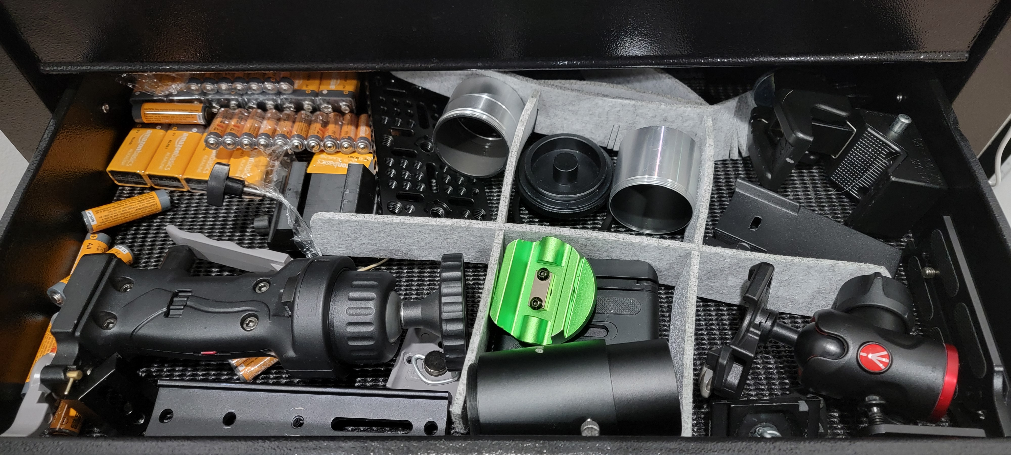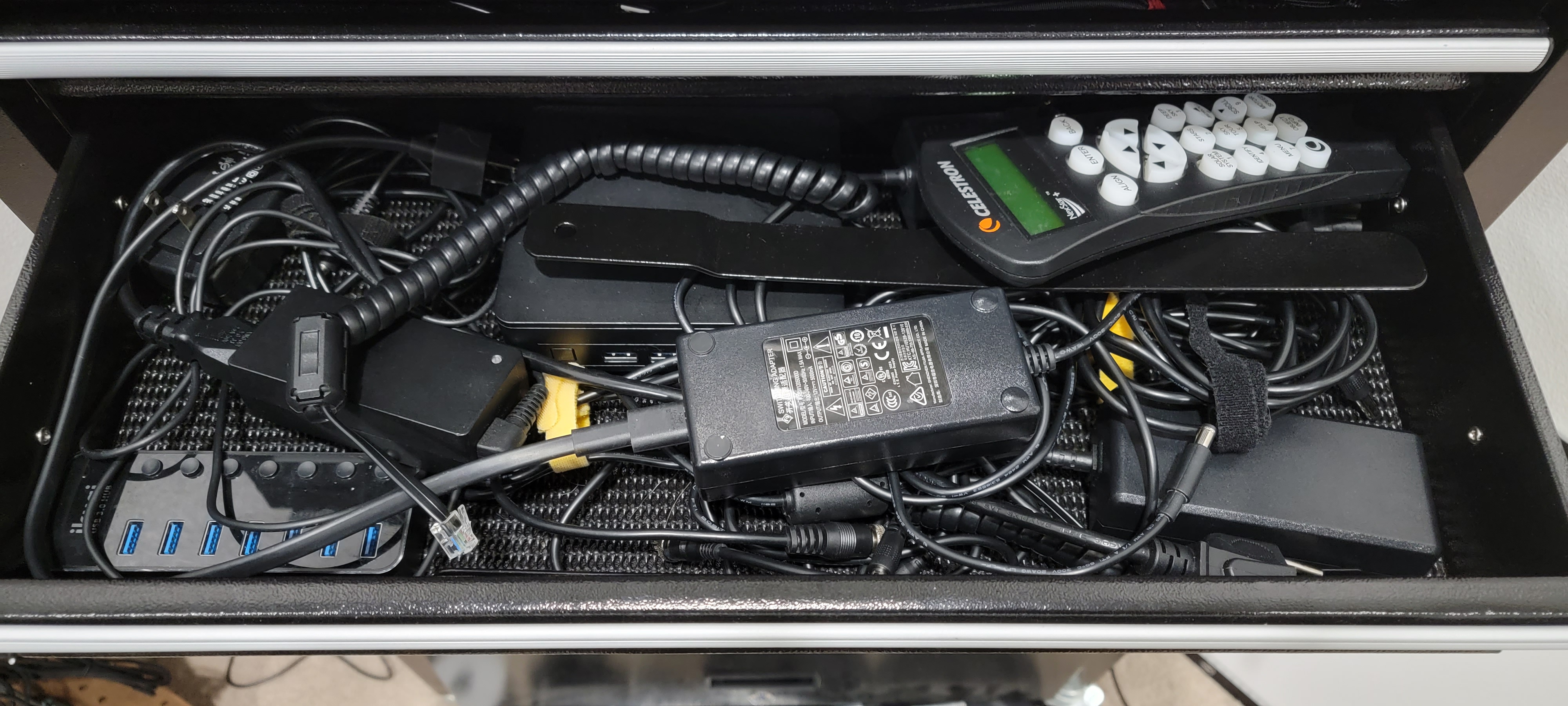 Another great investment for me was a tool chest that I bought on sale from a local home improvement store. Instead of storing tools, I store astrophotography gear. I picked up these bins to organize some items on top.