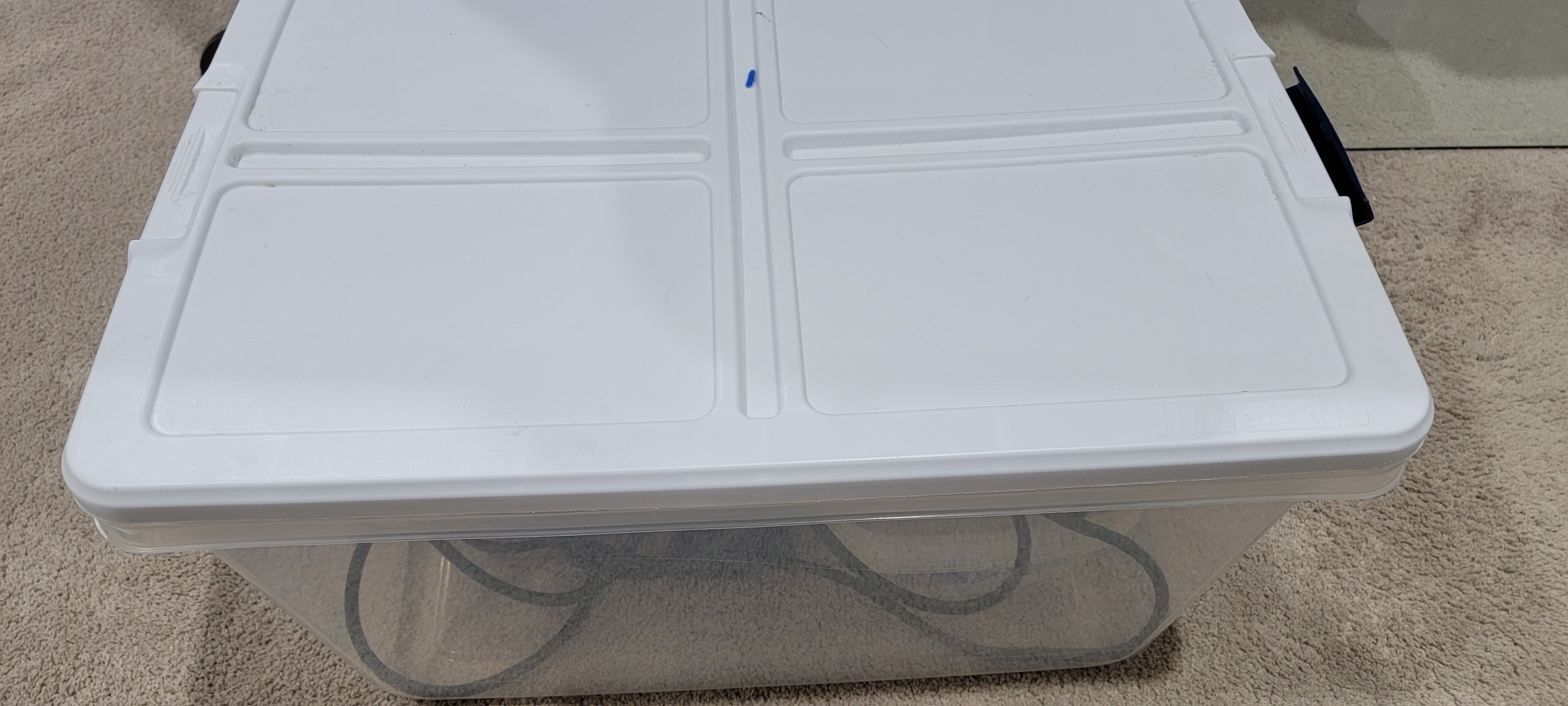 I use it to store my long outdoor extension cords. It also holds all of my cables and accessories I need to bring with my scope and mount. In the field, I can flip it and use the bottom as a table to keep plugs off the ground. I also have a hole cut in one corner. On extremely cold nights, I can put my laptop in the bin and run cables through the hole to keep it functional in below freezing temperatures.